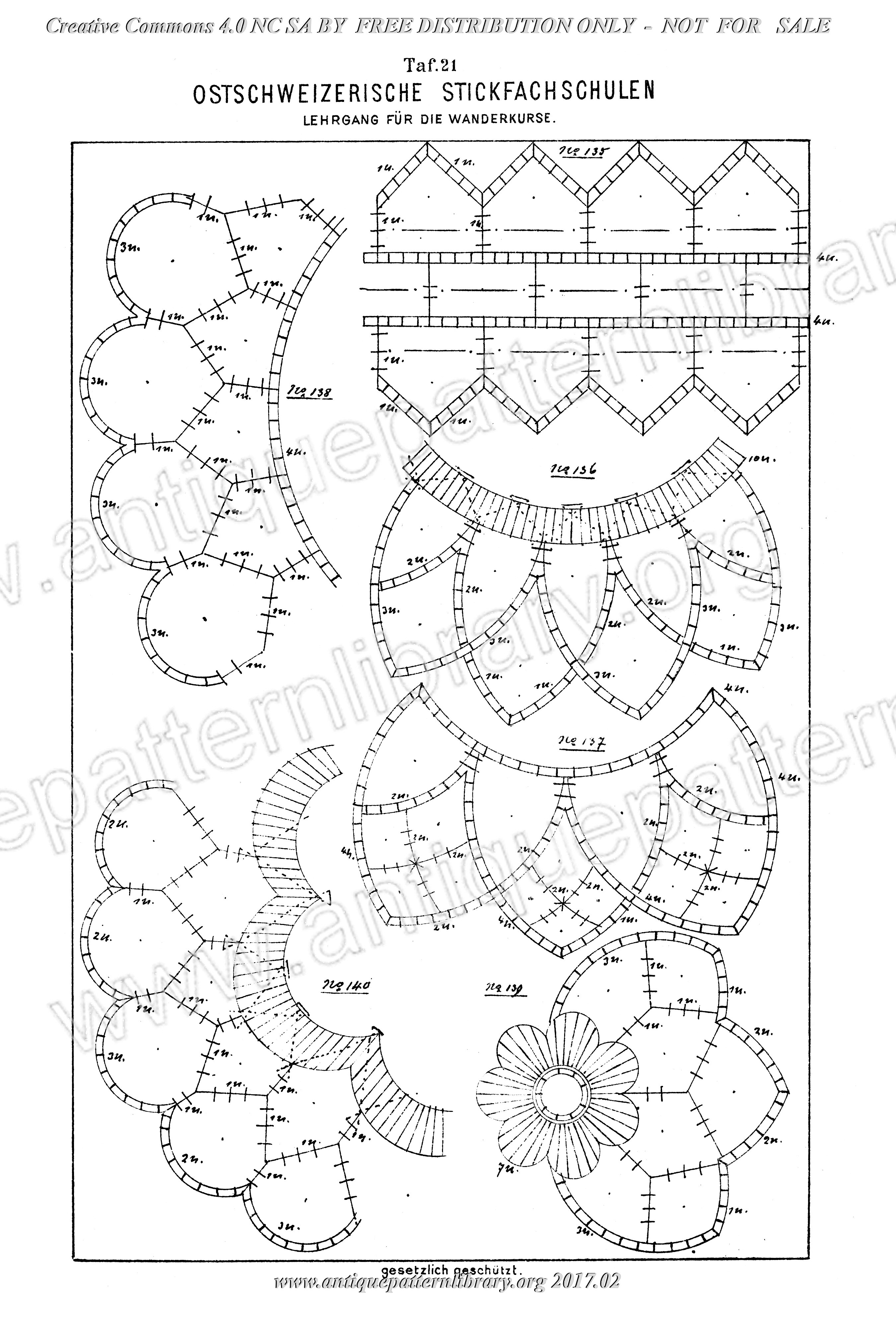 German language instructional manual on machine embroidery. 53 pages of designs, with some handwritten notes. No explanation for interpretation of the designs. Each page is headed Ostschweizerische Stickfachschulen, Lehrgang fur die Wanderkurse. Apparently these designs were used for embroidery courses given in various places in Switzerland. Most are also suitable for interpretation in hand embroidery, especially for cutwork and tape laces.