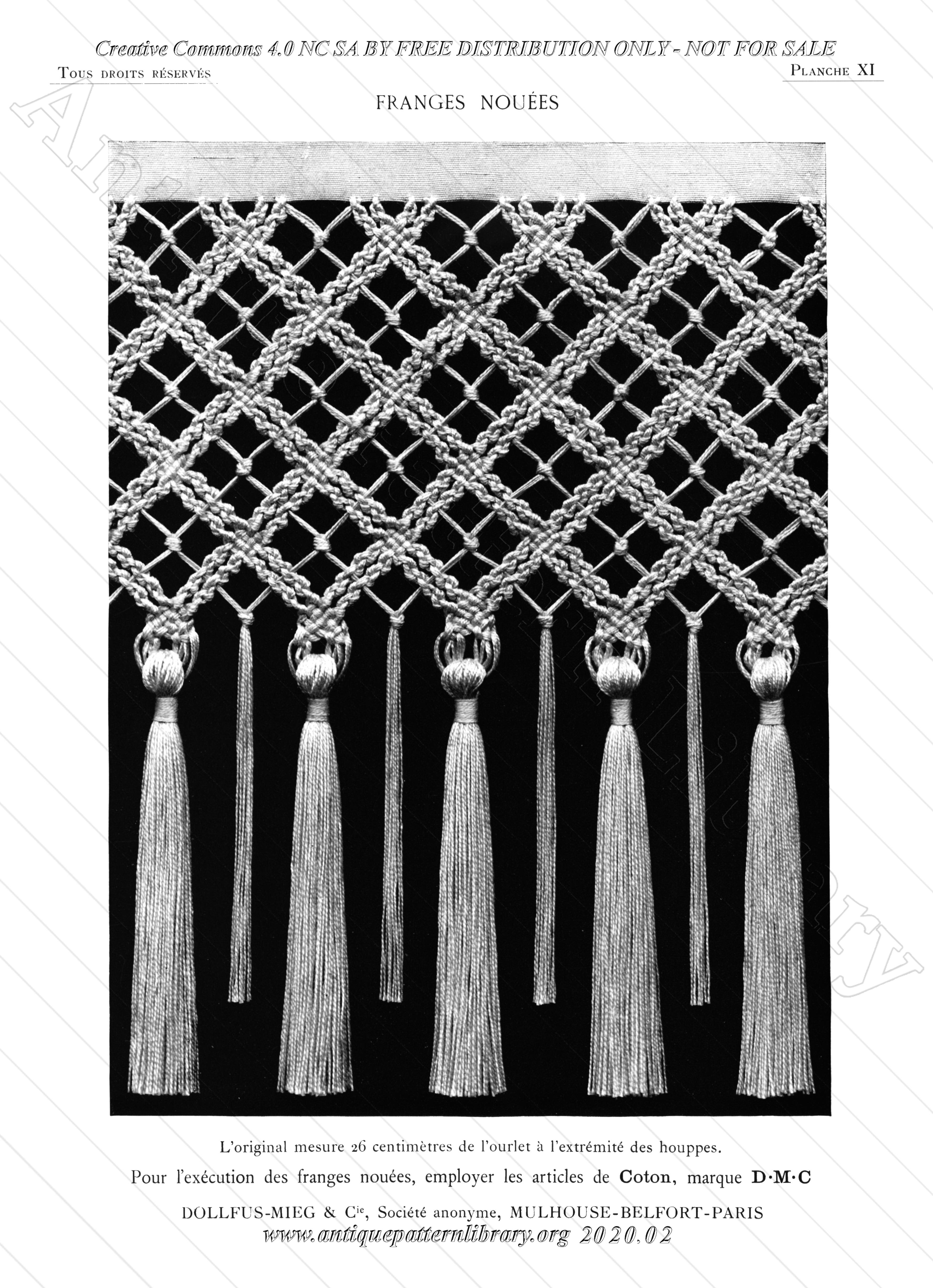68 pages including cover. 20 plates of complex knotted fringes, each with instructions on how to make the individual knots and group them together. Strong links with macrame work. This copy printed October 1928.