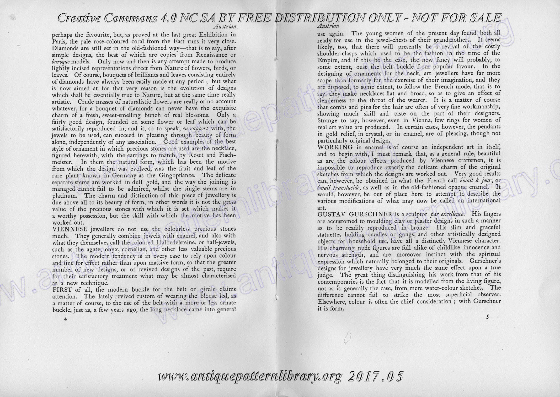 Fabulous collection of jewellery, personal ornaments, and fan designs very much in the Art Nouveau aesthetic. Black and white photos, full color illustrations. Designs from French, British, Austrian, German, Belgian, and Danish artisans and workshops are presented. Also an extensive set of interesting period advertisements for high end luxuries at the end of the work.