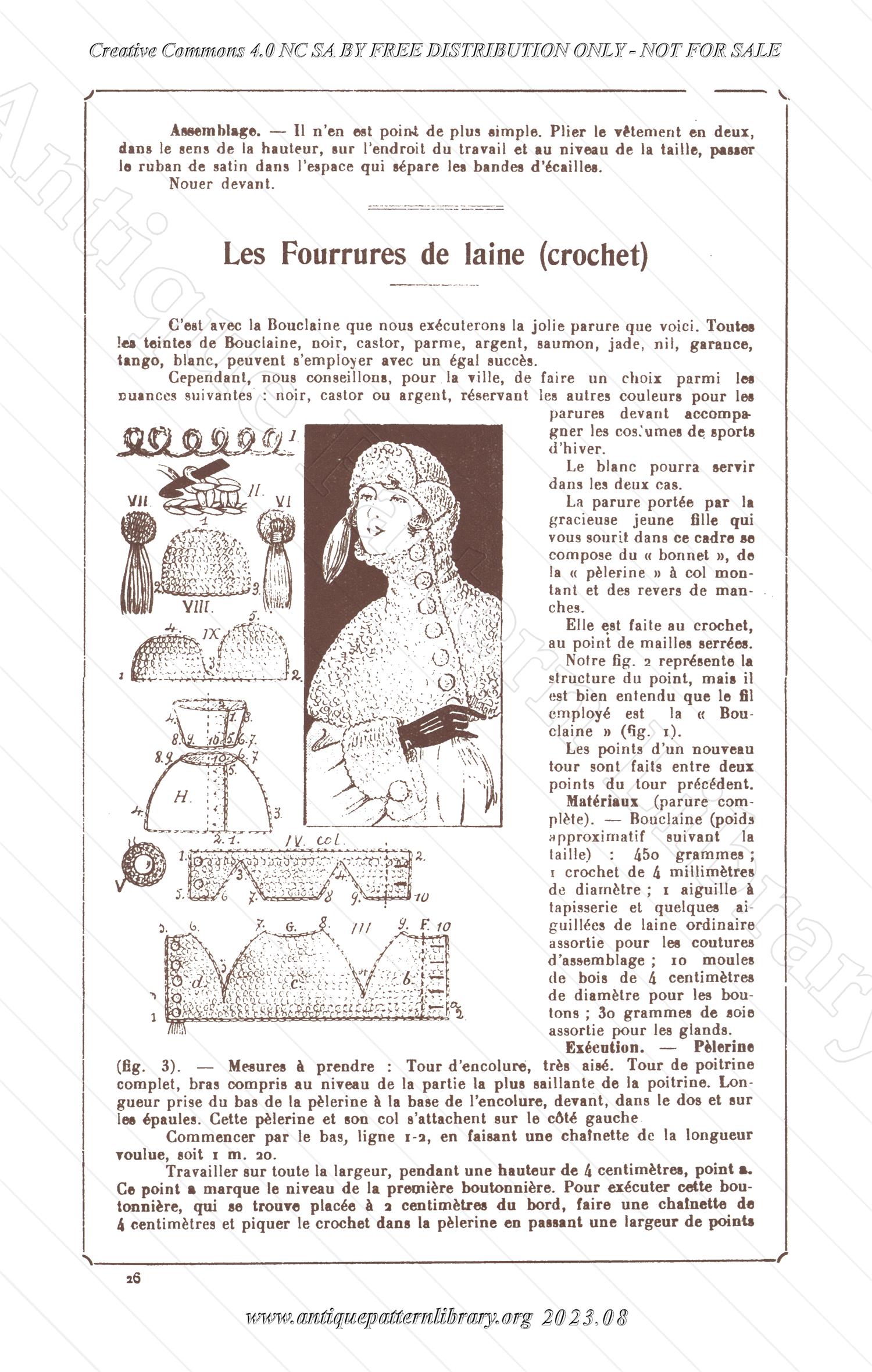 32 pages not including covers. No date, around 1920 based on style. Nineteen patterns for coats, housecoats, sweaters, hats, vests. Patterns are for knitting or crochet, some combined with embroidery. Inner sides of the cover are blank and have been omitted.