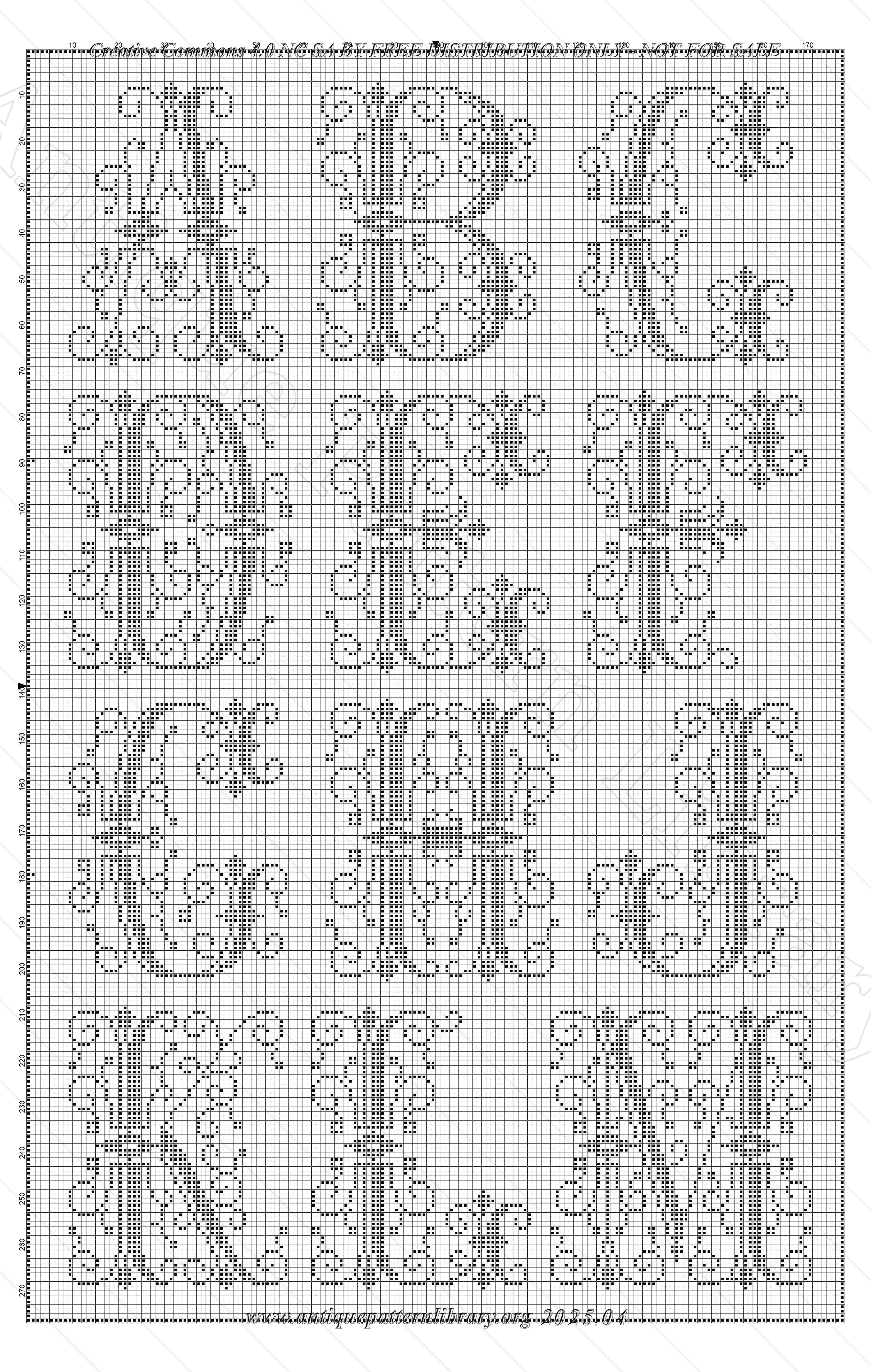 35 alphabets in cross-stitch, from small to quite large, and a medium and large alphabet for whitework or colored embroidery. Also a page with letter combinations and between the alphabets small motifs and mottos.