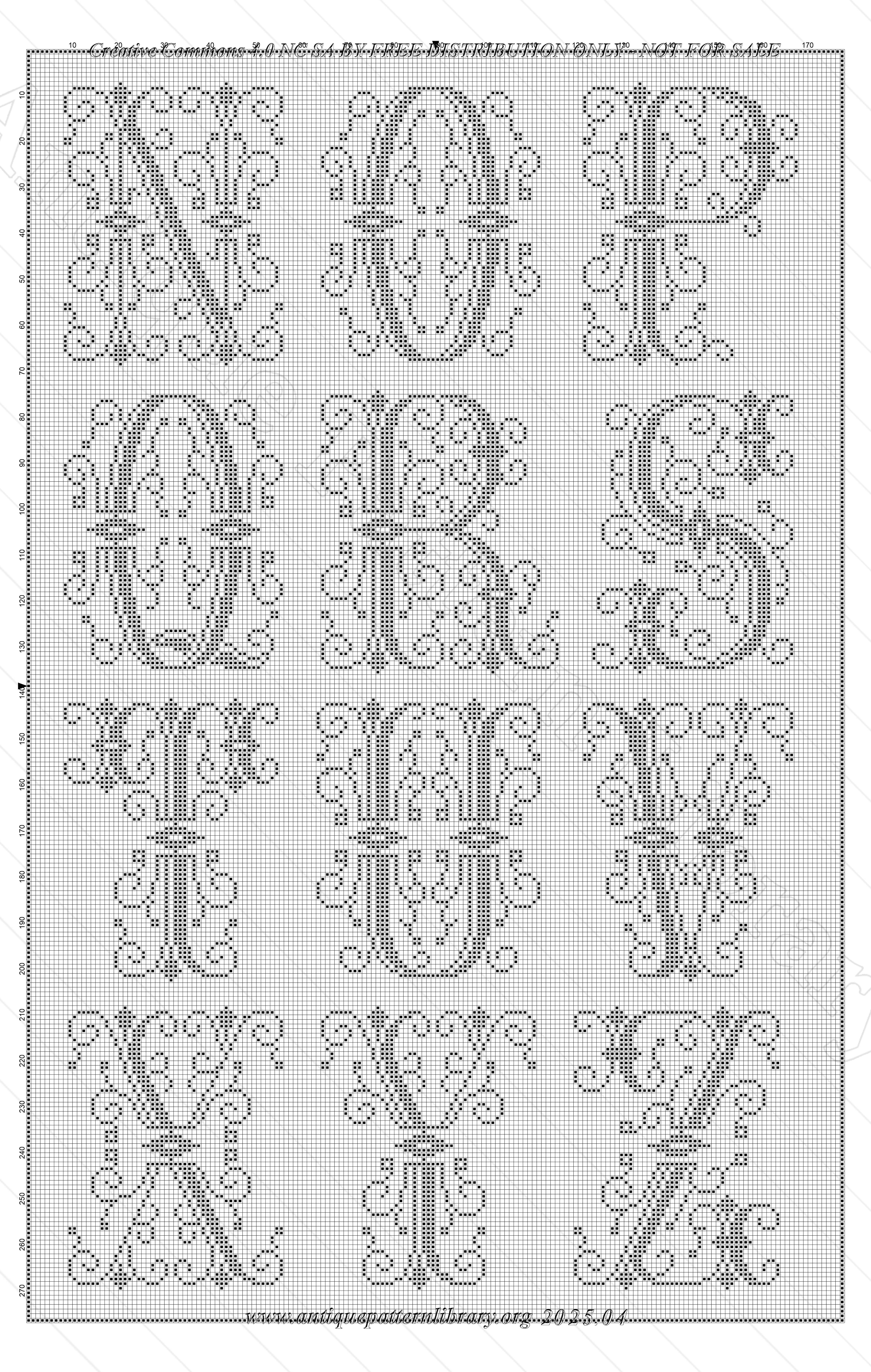 35 alphabets in cross-stitch, from small to quite large, and a medium and large alphabet for whitework or colored embroidery. Also a page with letter combinations and between the alphabets small motifs and mottos.