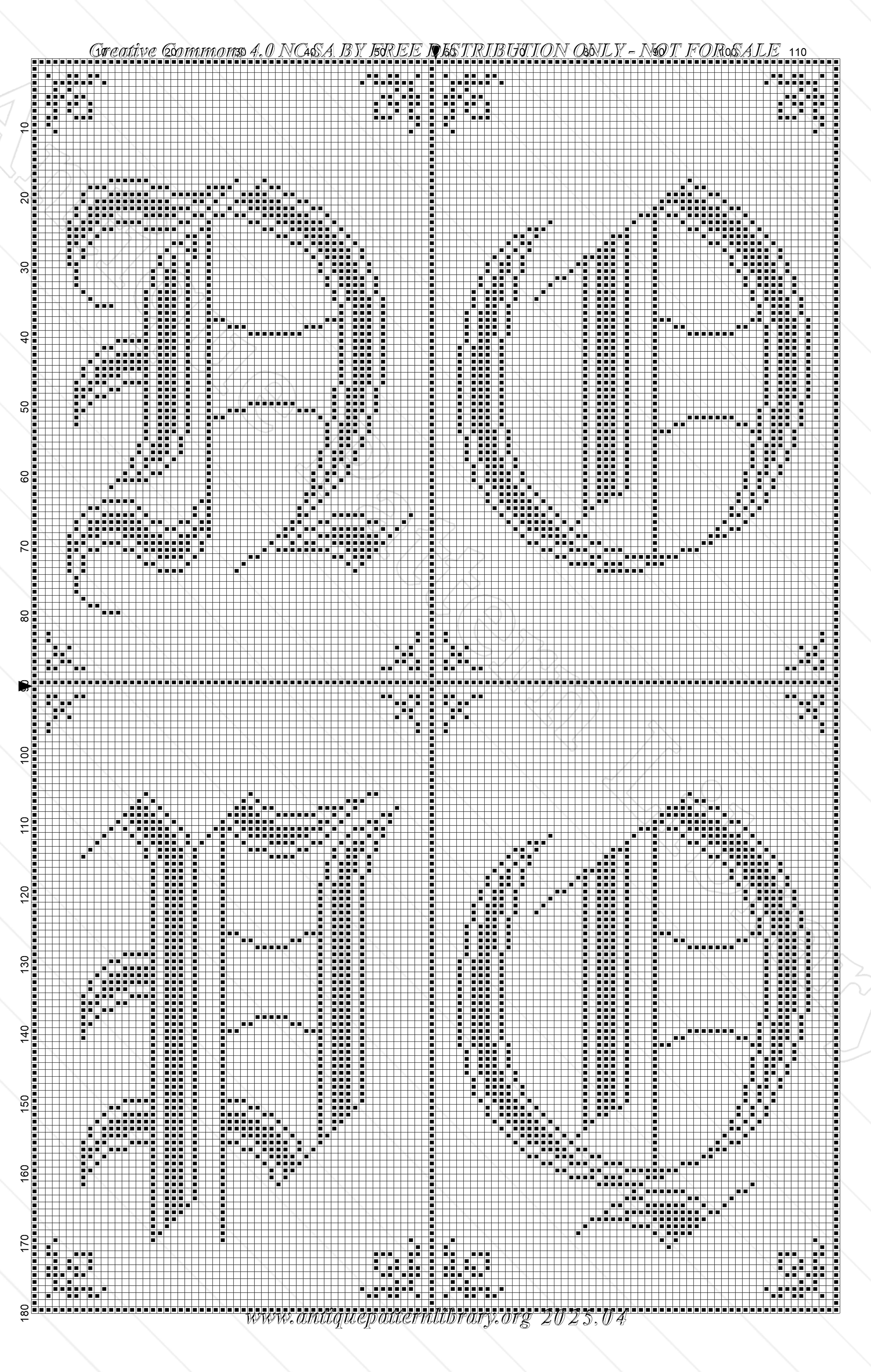 35 alphabets in cross-stitch, from small to quite large, and a medium and large alphabet for whitework or colored embroidery. Also a page with letter combinations and between the alphabets small motifs and mottos.