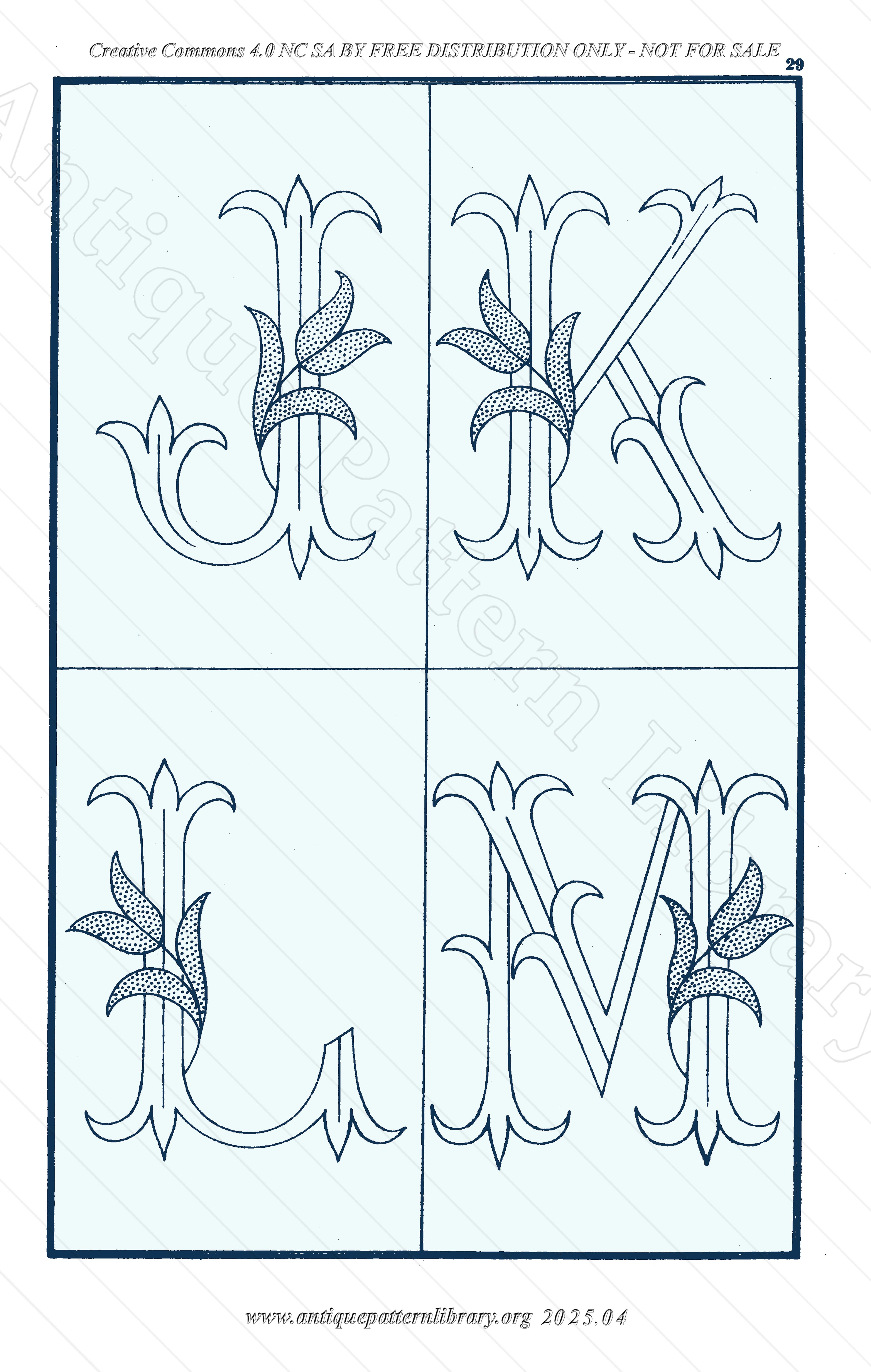 35 alphabets in cross-stitch, from small to quite large, and a medium and large alphabet for whitework or colored embroidery. Also a page with letter combinations and between the alphabets small motifs and mottos.
