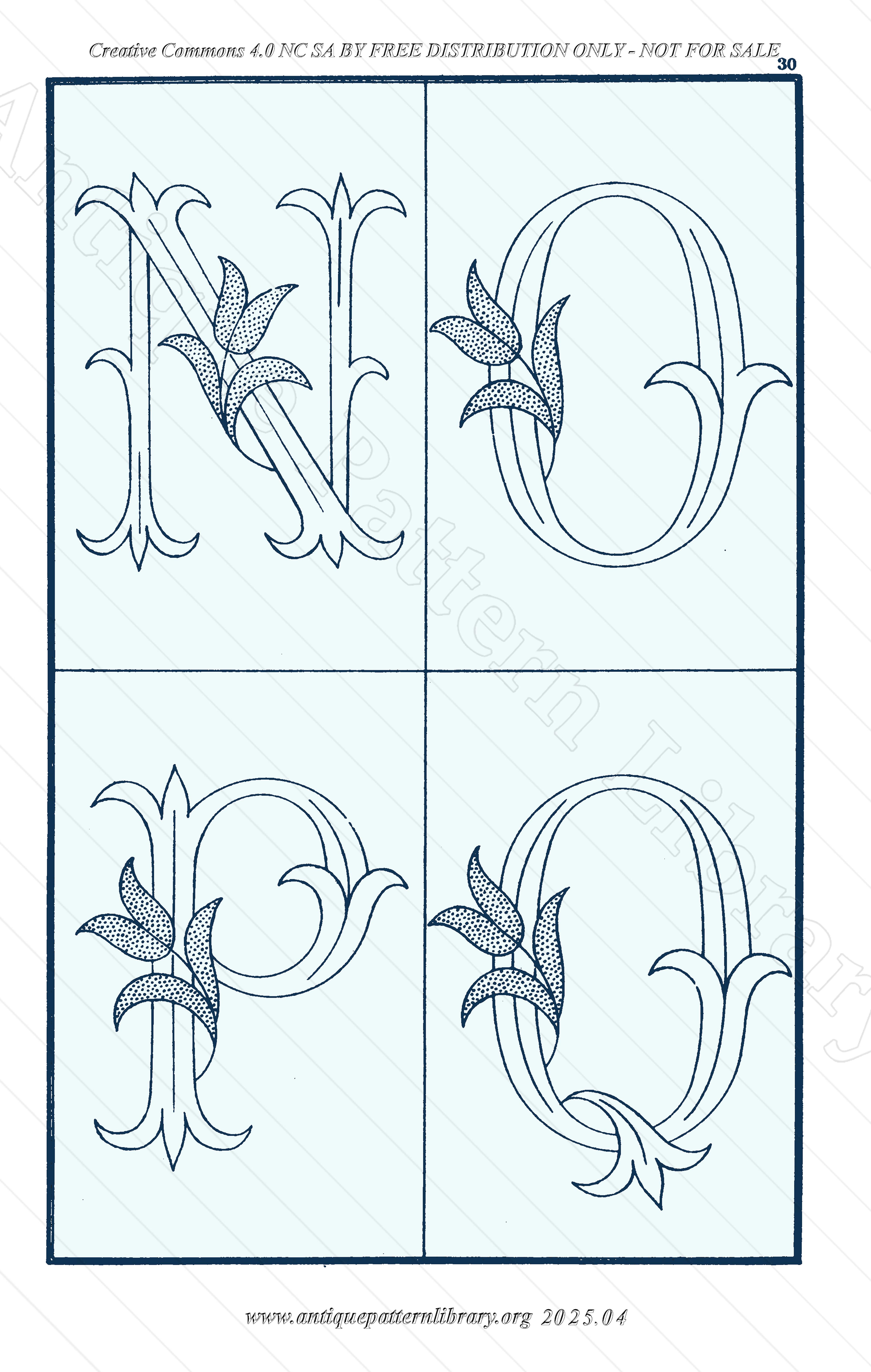 35 alphabets in cross-stitch, from small to quite large, and a medium and large alphabet for whitework or colored embroidery. Also a page with letter combinations and between the alphabets small motifs and mottos.