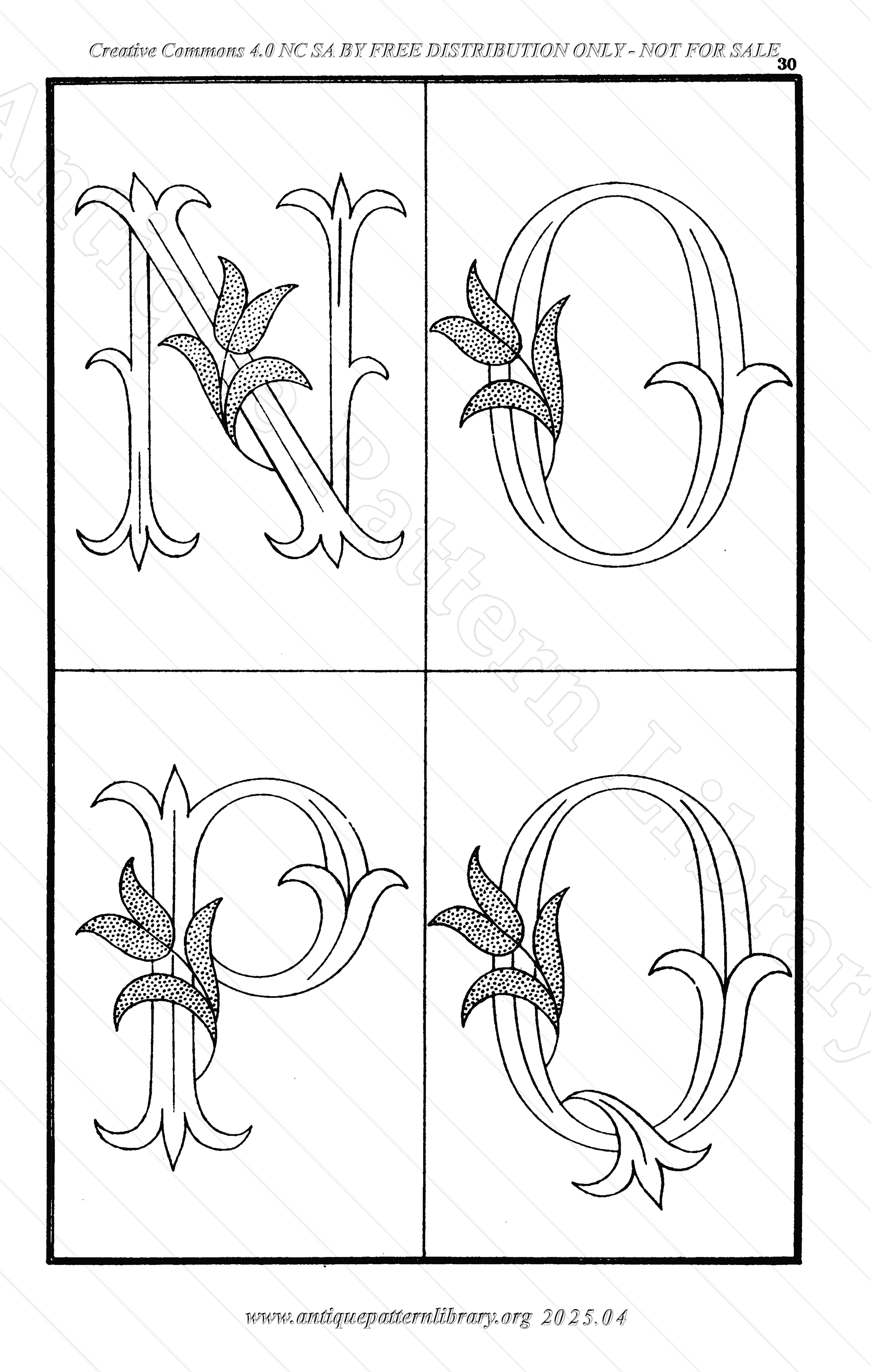 35 alphabets in cross-stitch, from small to quite large, and a medium and large alphabet for whitework or colored embroidery. Also a page with letter combinations and between the alphabets small motifs and mottos.