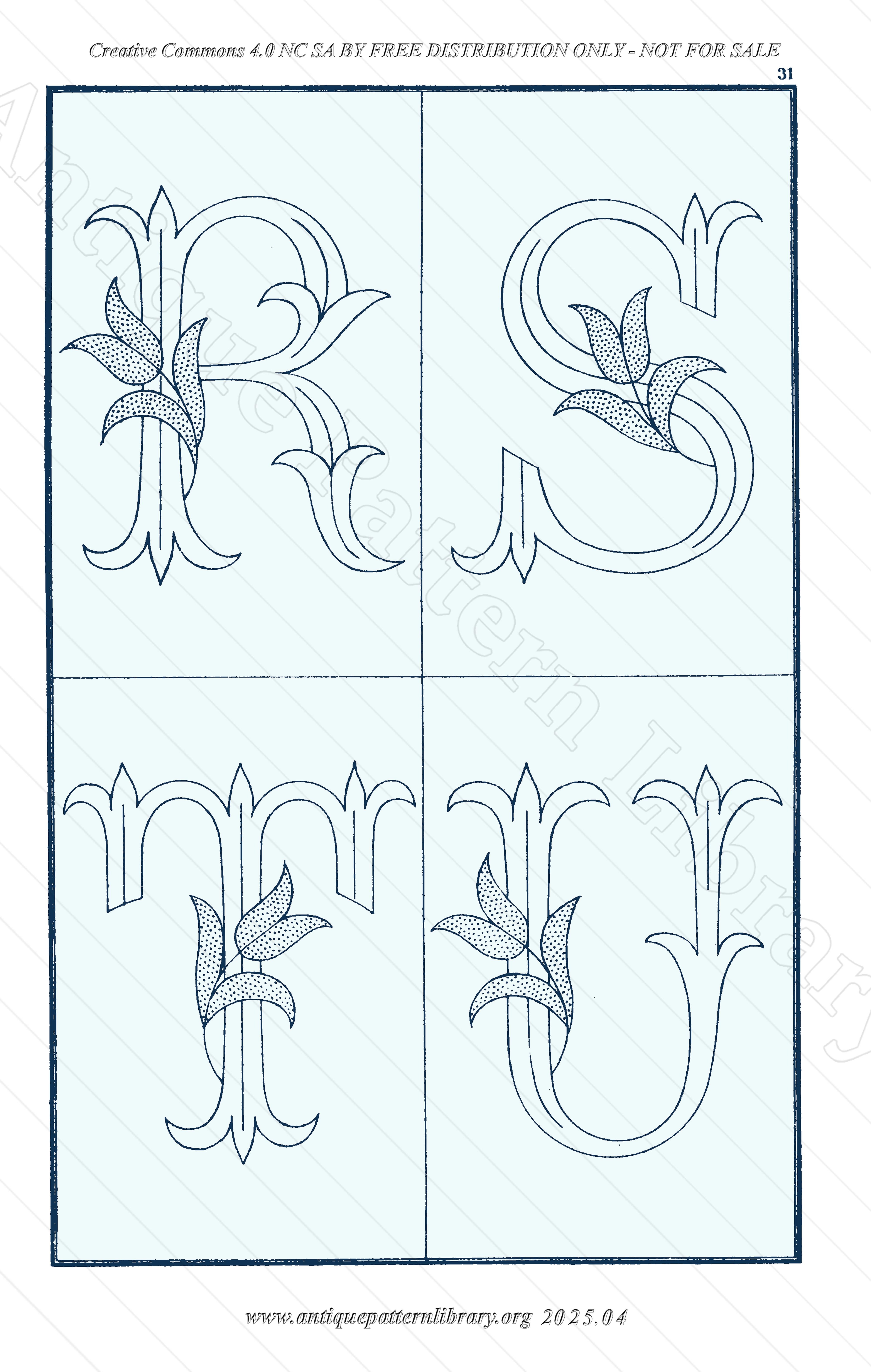 35 alphabets in cross-stitch, from small to quite large, and a medium and large alphabet for whitework or colored embroidery. Also a page with letter combinations and between the alphabets small motifs and mottos.