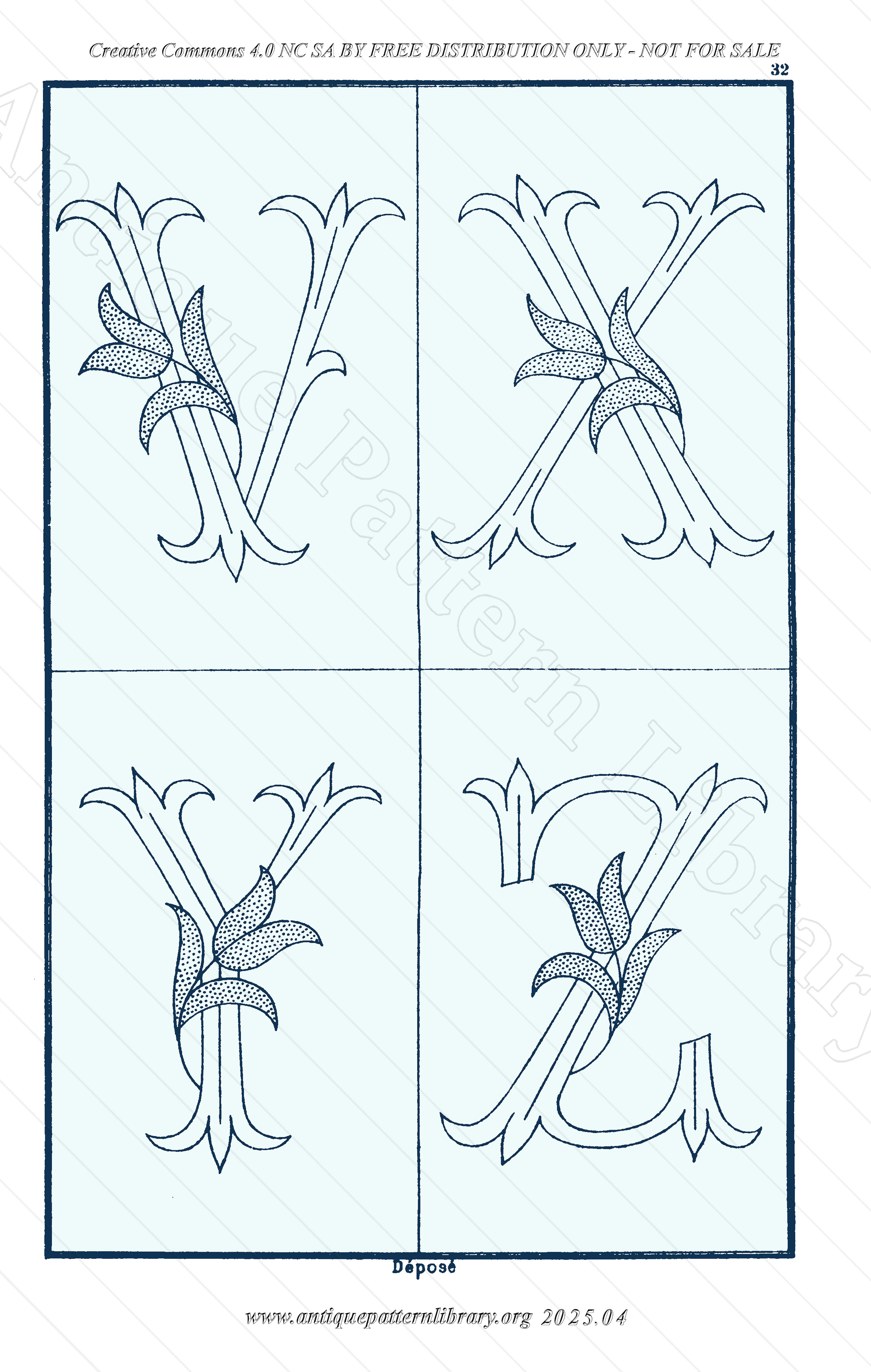 35 alphabets in cross-stitch, from small to quite large, and a medium and large alphabet for whitework or colored embroidery. Also a page with letter combinations and between the alphabets small motifs and mottos.