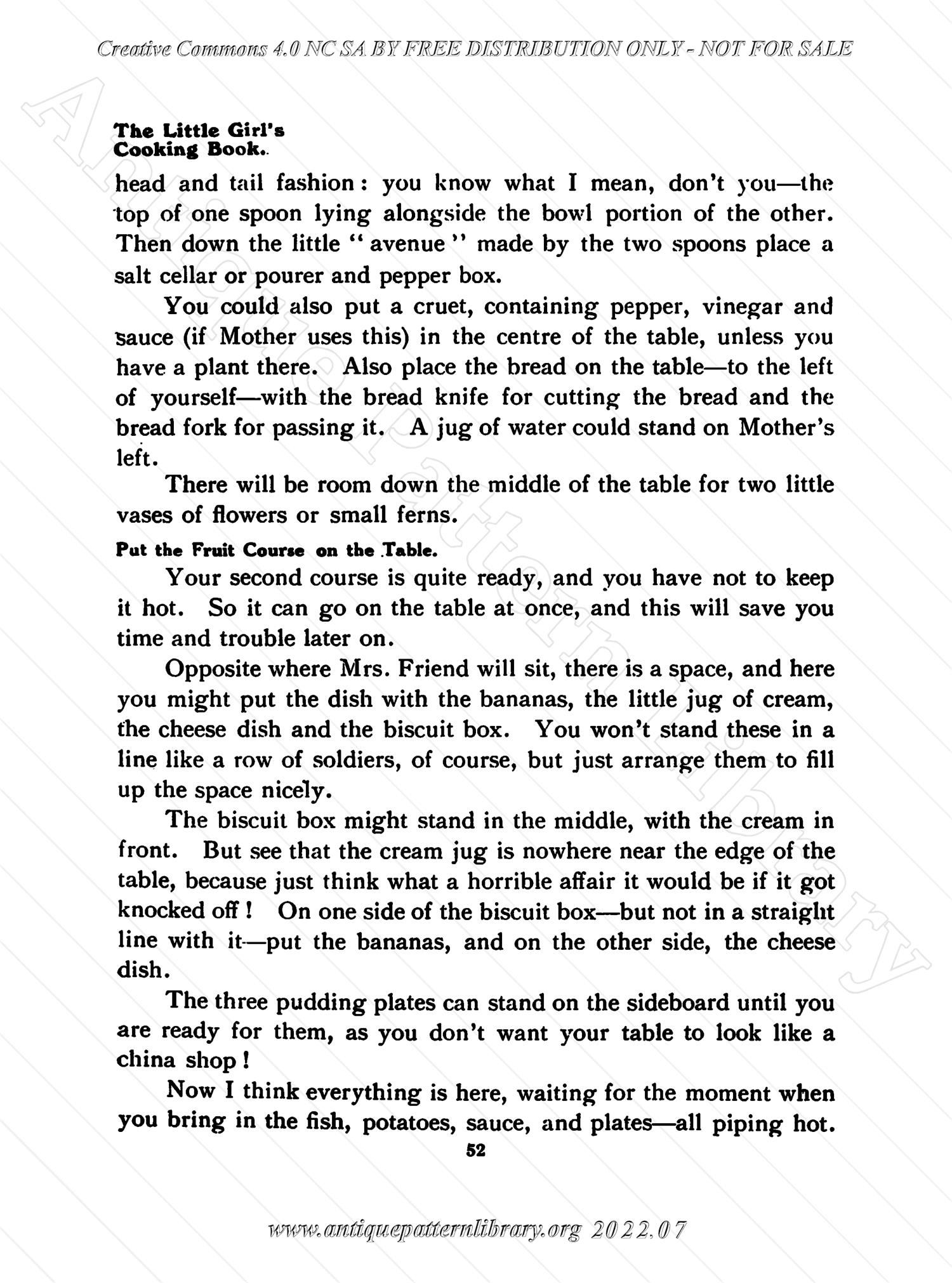 Small hardcover, 68 pages excluding covers, colofon and title pages. Contains receipes and an extensive explanation of the methods of working and the reasoning behind it. The author addresses the reader directly. Apple tarts, cakes, making lemonade, trifle, plum pudding, boiling fish and eggs and potatoes and many similar items, as well as laying and clearing a table, washing up dishes, weighing ingredients.