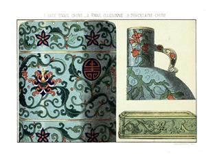 Fifteen colored plates as examples for painting on pottery and porcelain. Plates, vases, water fountain, serving platters and just the painted designs.