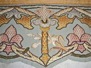 Hand embroidered valance, probably for a church. Lining has been taken out. Embroidery in gold and pink shades, outlined in black and pink couched chenille thread and gold cord, on gray green fabric.
