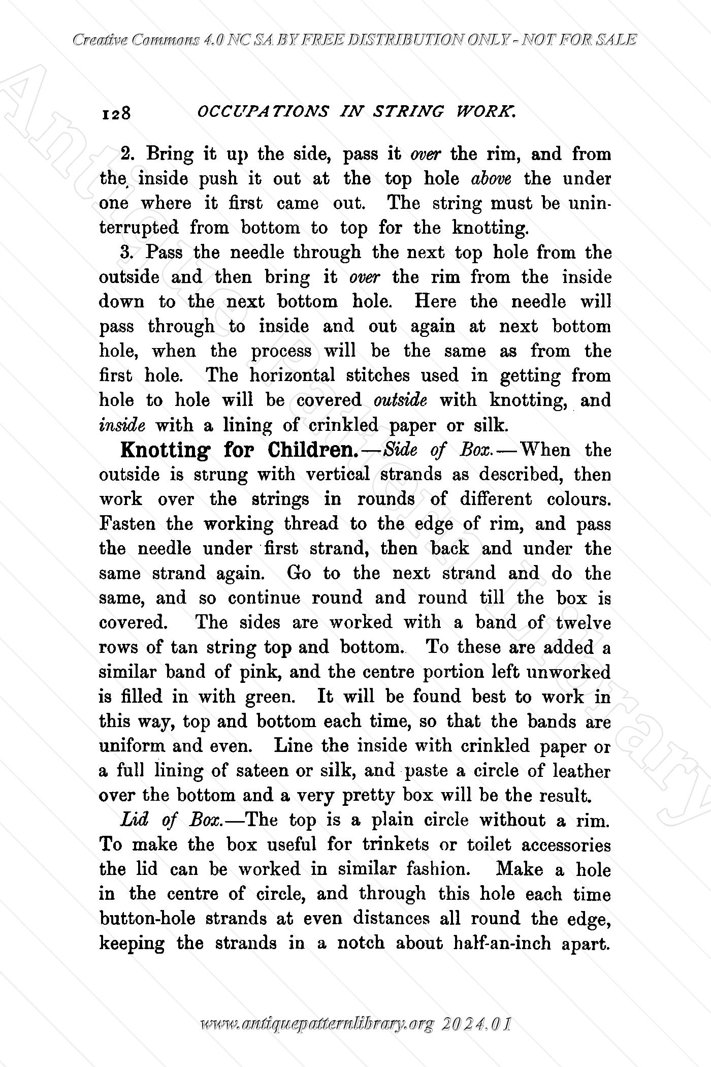Small hardcover bound book, containing instructions on how to teach little children knotting and macrame. Three sections, building up from simple knots to complex objects made by knotting thread, fringes, and hairpin lace.