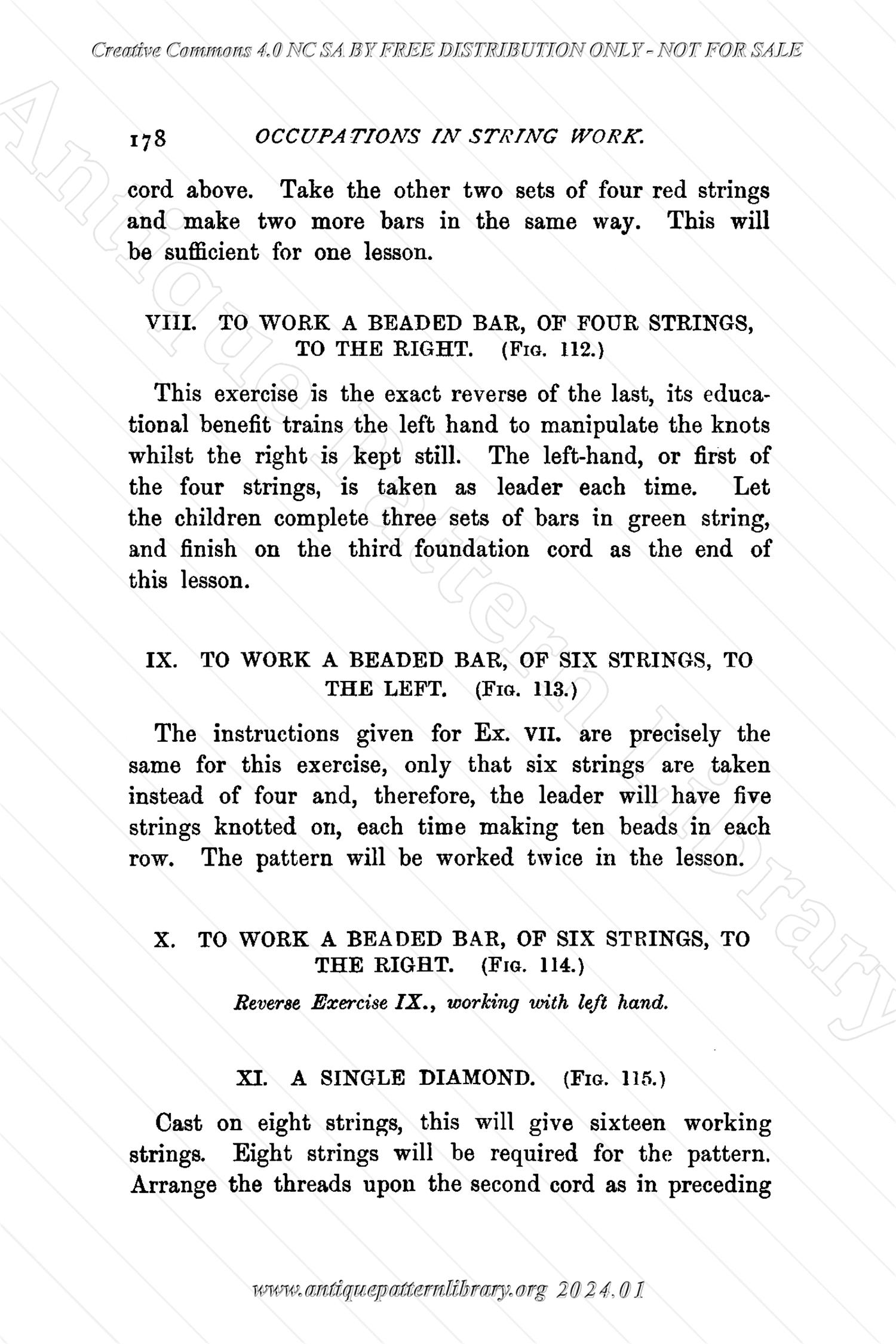Small hardcover bound book, containing instructions on how to teach little children knotting and macrame. Three sections, building up from simple knots to complex objects made by knotting thread, fringes, and hairpin lace.