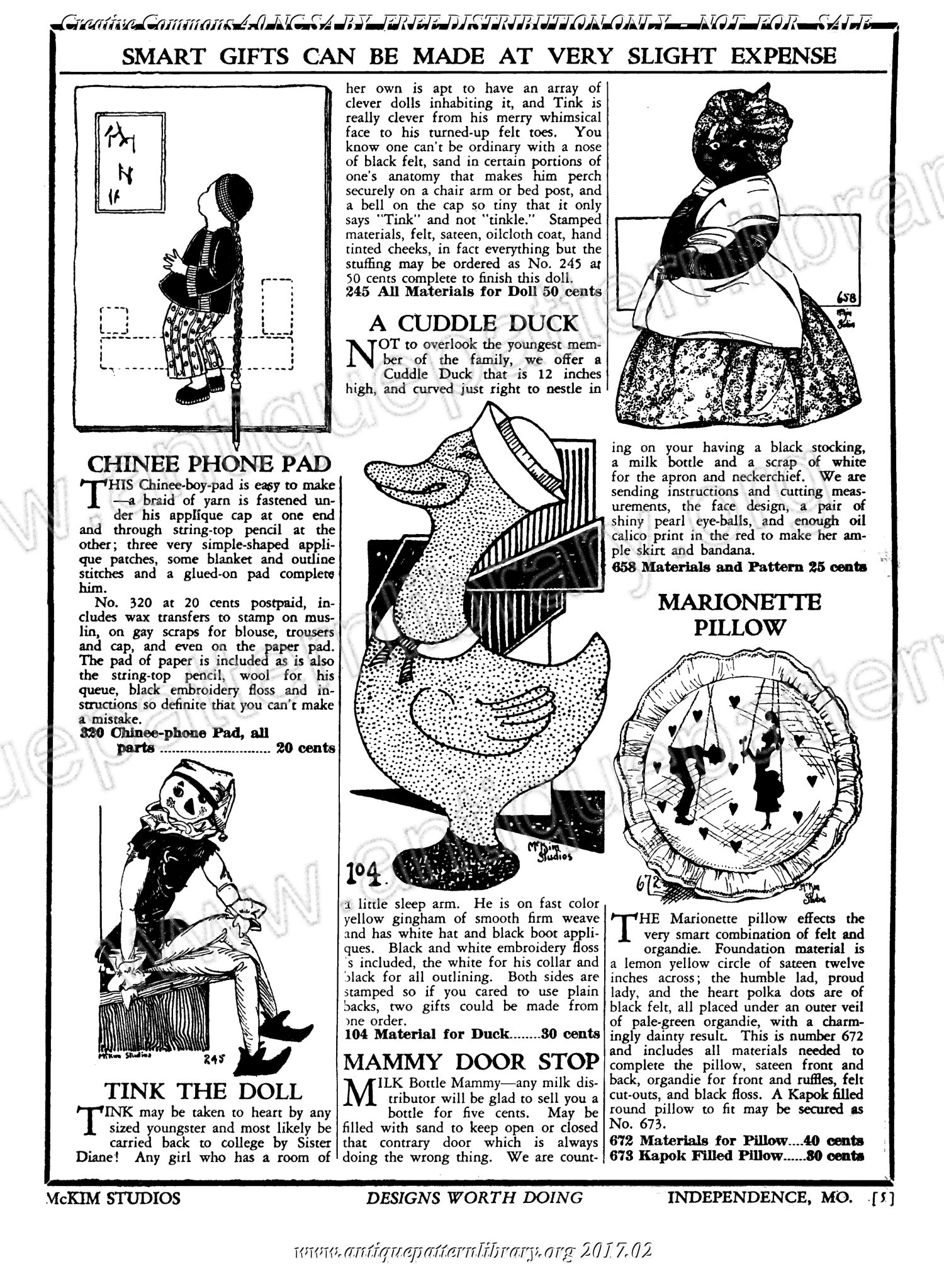 A 52-page catalogue of ads for mail-order needlework project instructions, supplies, pre-cut fabric, patterns, and ready-made items. Includes aprons, towels, toys, clothing, household linens, cushion covers, curtains, quilt blocks and quilting designs, rugs, party favors and bazaar items, door stops, and more. Many illustrations are clear enough to execute the pattern from. Inspiration for many hours of needlework.