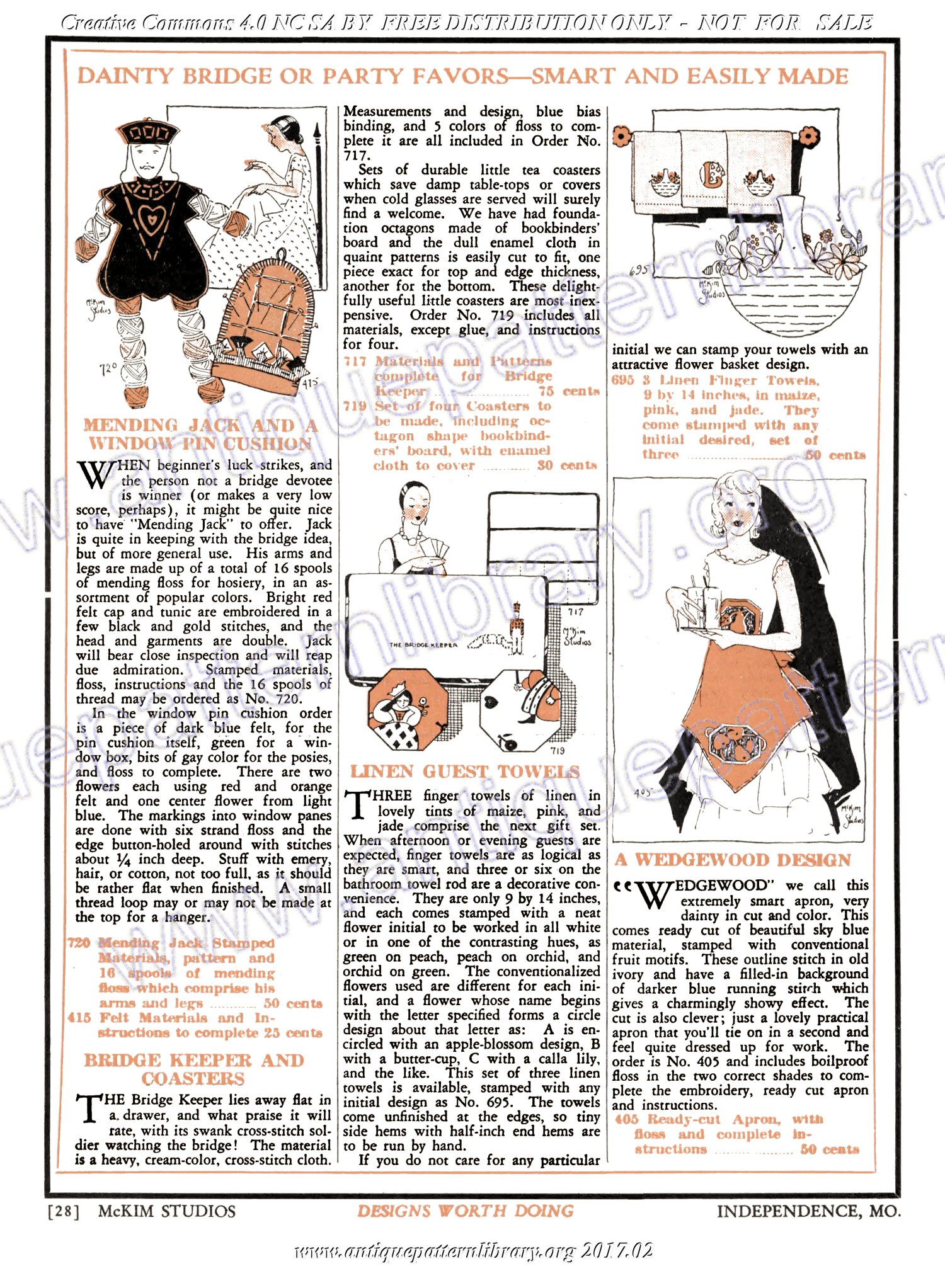 A 52-page catalogue of ads for mail-order needlework project instructions, supplies, pre-cut fabric, patterns, and ready-made items. Includes aprons, towels, toys, clothing, household linens, cushion covers, curtains, quilt blocks and quilting designs, rugs, party favors and bazaar items, door stops, and more. Many illustrations are clear enough to execute the pattern from. Inspiration for many hours of needlework.