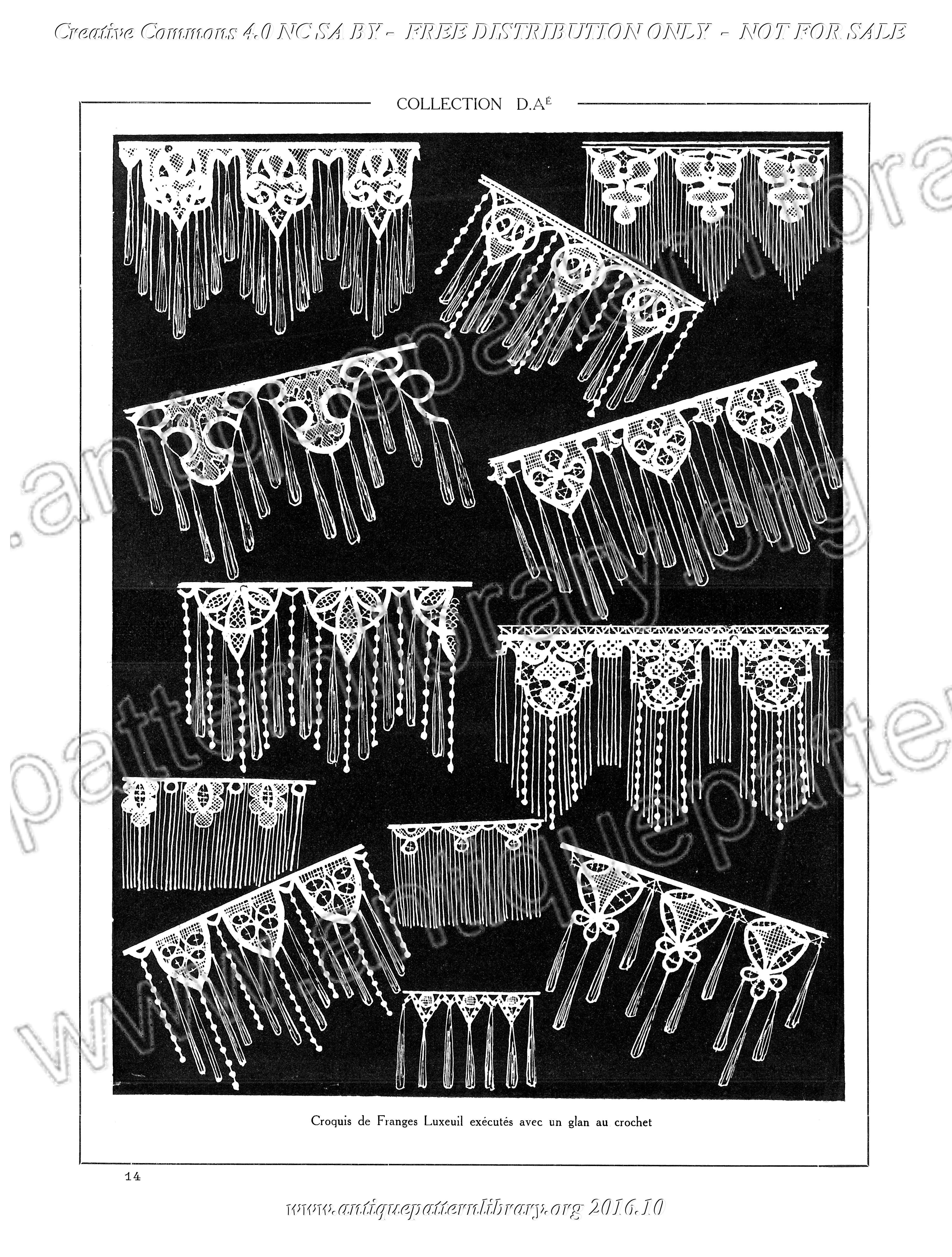French language booklet showing very elaborate passmenterie/fringe trims, most with tassels. Techniques used include crochet, needle lace, macrame, and braiding. Possibly also pillow lace. Close-up photos of finished trim plus materials/technique notes are provided, but detailed patterns aren't included.