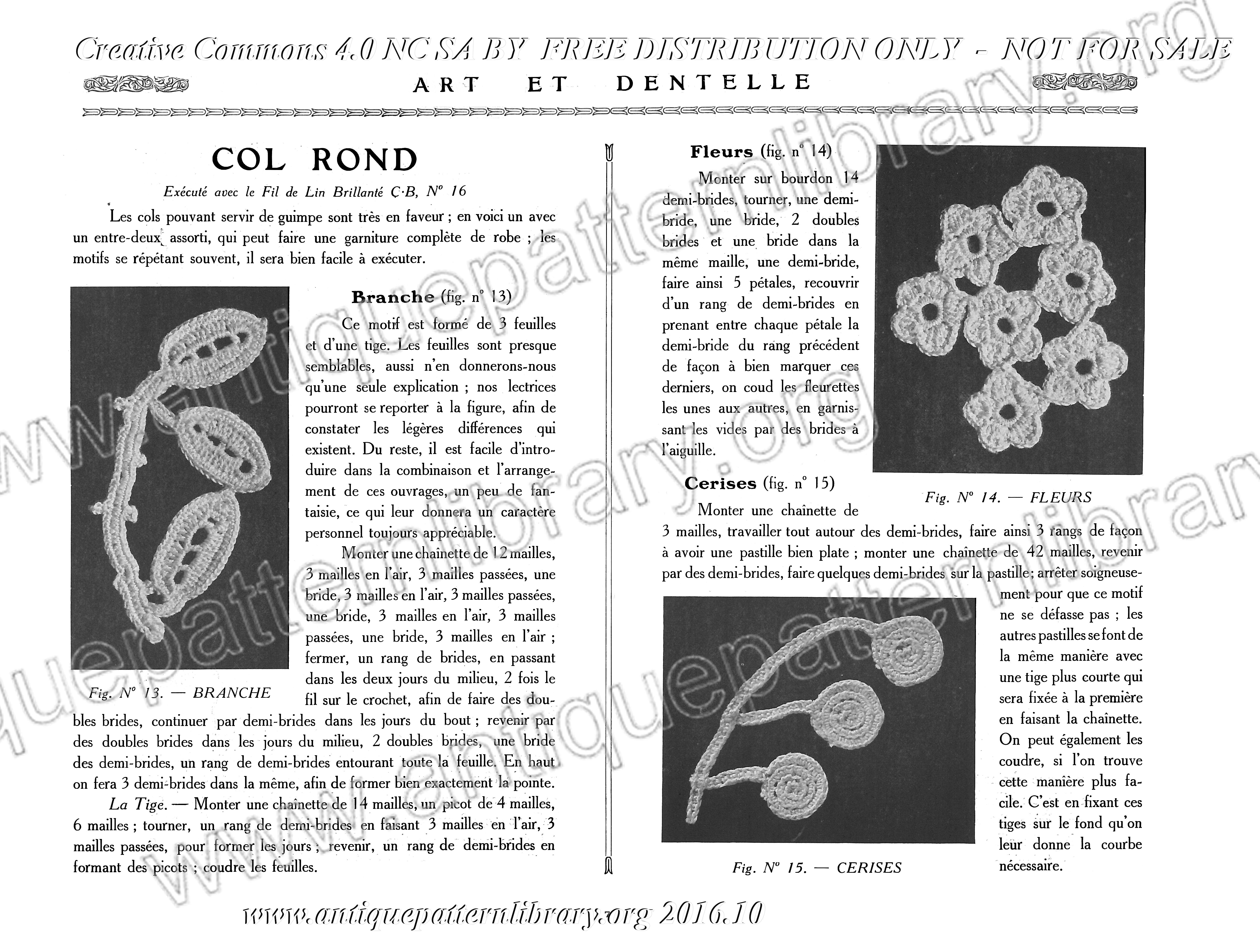 French language patterns for ornate openwork thread crochet in the style of Venetian lace. Motifs plus instructions for joining them with picoted brides and crocheted net grounds to make up collars, insertions, yokes, scarf ends, pincushions, pillow covers, passmenterie fringes, and more.