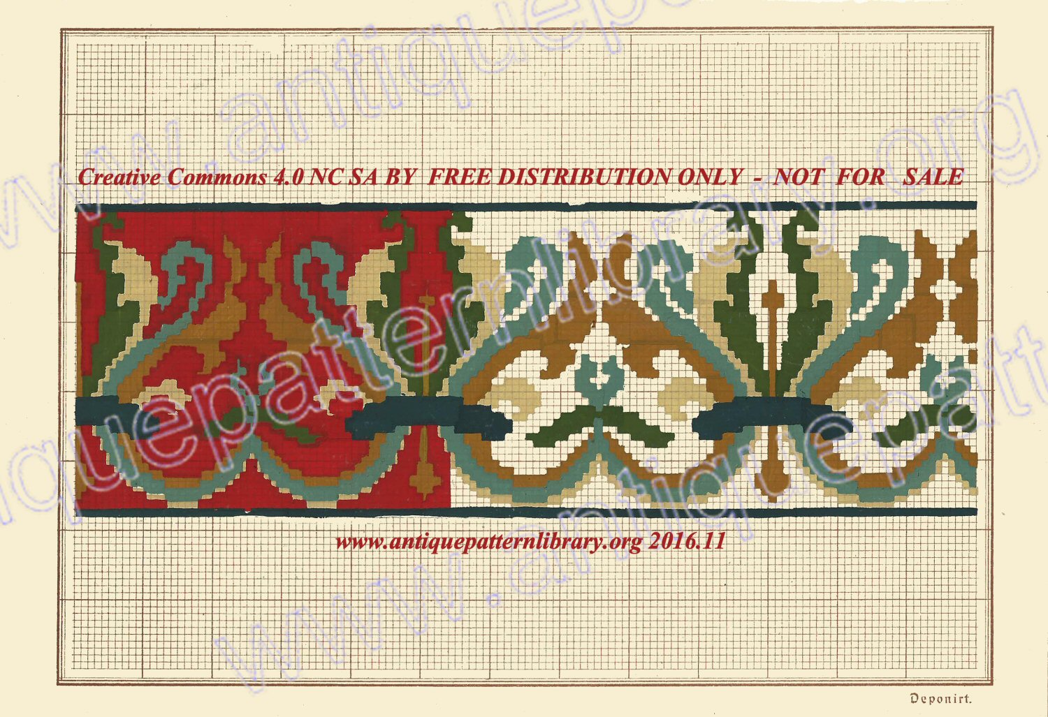 Small single handpainted charted multicolor border pattern, in muted colors on a red ground. Possibly a frament of a larger leporello (folded booklet). No publisher's credit on the piece, but the grid size used and the text "Deponirt" in a characteristic font may indicate Heinrich Kuehn is the source. Design accompanied by modern recharting and DMC color key. Suitable for Berlin woolwork, needlepoint, cross-stitch, and beading.