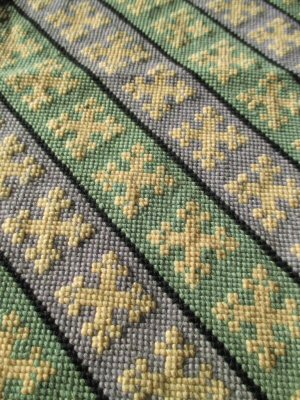 Charted multicolor design of diagonal stripes featuring heraldic crosses (possibly flory crosses, but hard to tell from small scale). Charted from Victorian era artifact (photo included.) Muted greys, yellows and greens, intended for needlepoint, Berlin woolwork, cross-stitch or beading. Includes modern re-charting and DMC color key.