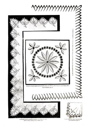Weekly periodical with various types of needlework, a cross-stitch pattern on the front cover, round or square depending on execution. A large Battenberg lace design, whitework embroidery, initials M, and a smaller G and S, and three pages with text and advertisements.