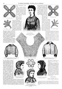 8 pages, page 4 and 5 forming a single central plate, but here shown separately. French fashion magazine appearing weekly. This is the eleventh year, no. 6. The pattern sheet was either not included or is missing. Princing varies depending on inclusion of pattern sheet and/or colored engravings. This issue shows an Irish crochet collar, several jackets, and the fashion plates.