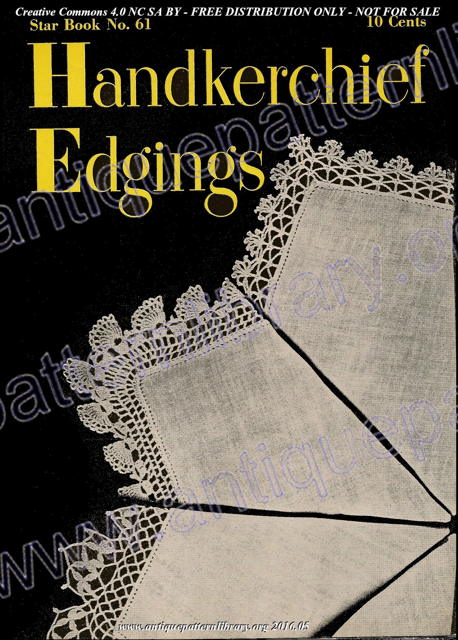 Collection of patterns for handkerchief edgings and corners in thread crochet. Some filet crochet, one very wide and elaborate edging formed of motifs joined together. Directions for all given in prose (no charts). American notation.