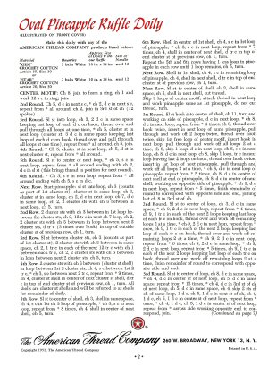16 page booklet of doilies. Mostly crochet, but includes one hairpin crochet, one knitted, and one tatted project. Frilled doilies are also presented without the ruffled edgings, as flat pieces. One filet crochet chart for a bread cover, rest of the instructions are prose, American notation.