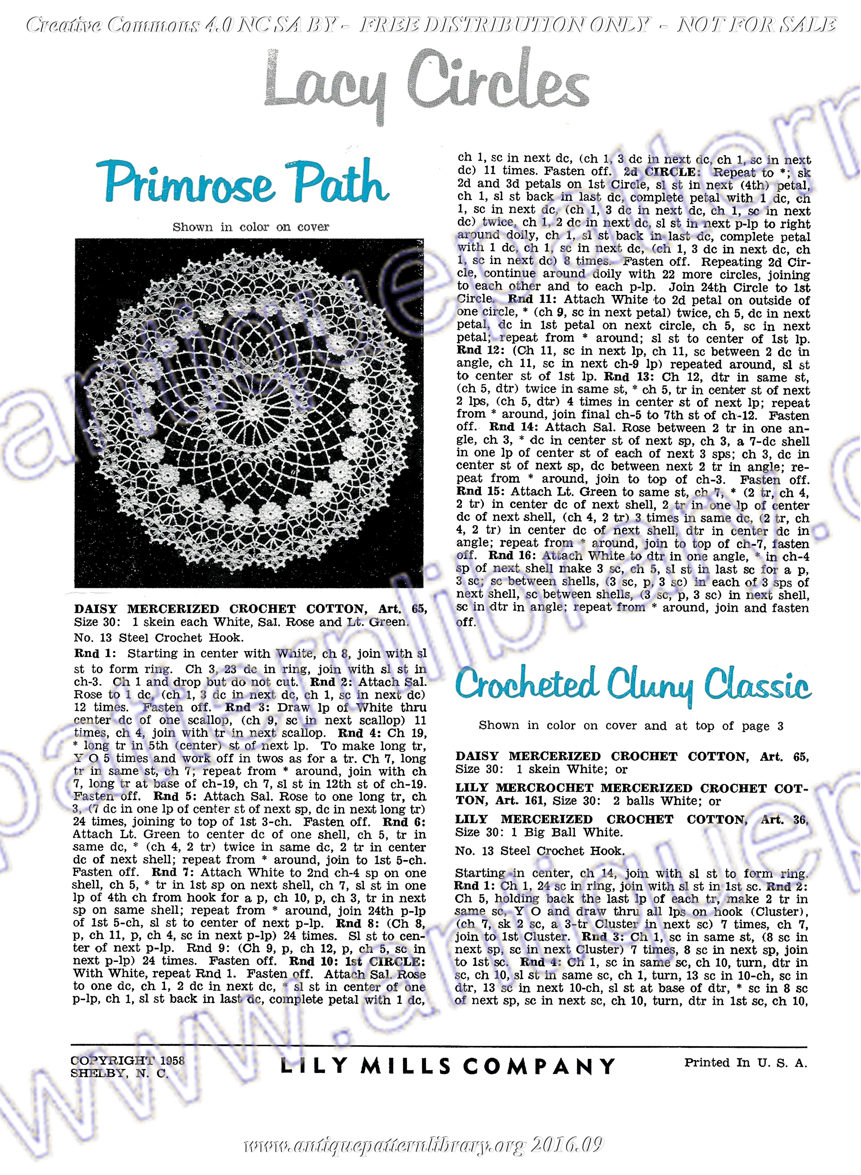 Patterns for multicolor doilies, chair protectors (antimacassars), and other small covers. One charted filet crochet project. Two heavy multicolor placemats; buffet table top, hairpin crochet placemats. Instructions in prose, American notation. Very 1950s in style.