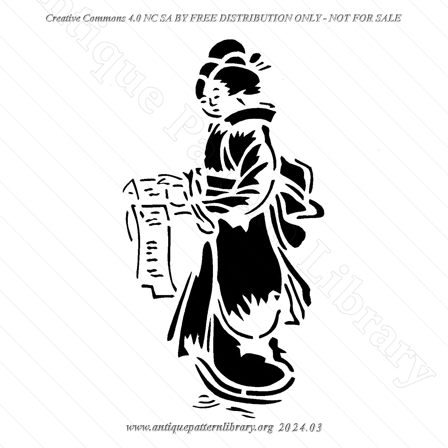 Fifteen small Katagamis. Seven Japanese ladies, two floral designs, and six birds. Used for egg-painting and kept together in an envelope. Edited version is black on white, to allow for easier printing.