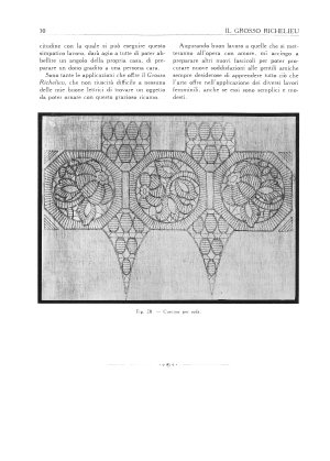 Italian language manual for working Richelieu cutwork, a combination of heavily overembroidred whitework foregrounds, and cutwork backgrounds with picoted brides (ornamented attachment bars). Works shown by photograph in progress, some also given as pattern sketches, with stitch directions indicated.