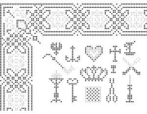 16 pages of charted pattern for cross-stitch or needlepoint. Shown multiple tones using grey scale. Mostly borders, geometrics and arabesques, plus butterfly, shell, and devotional motifs. No date, but looks quite old.