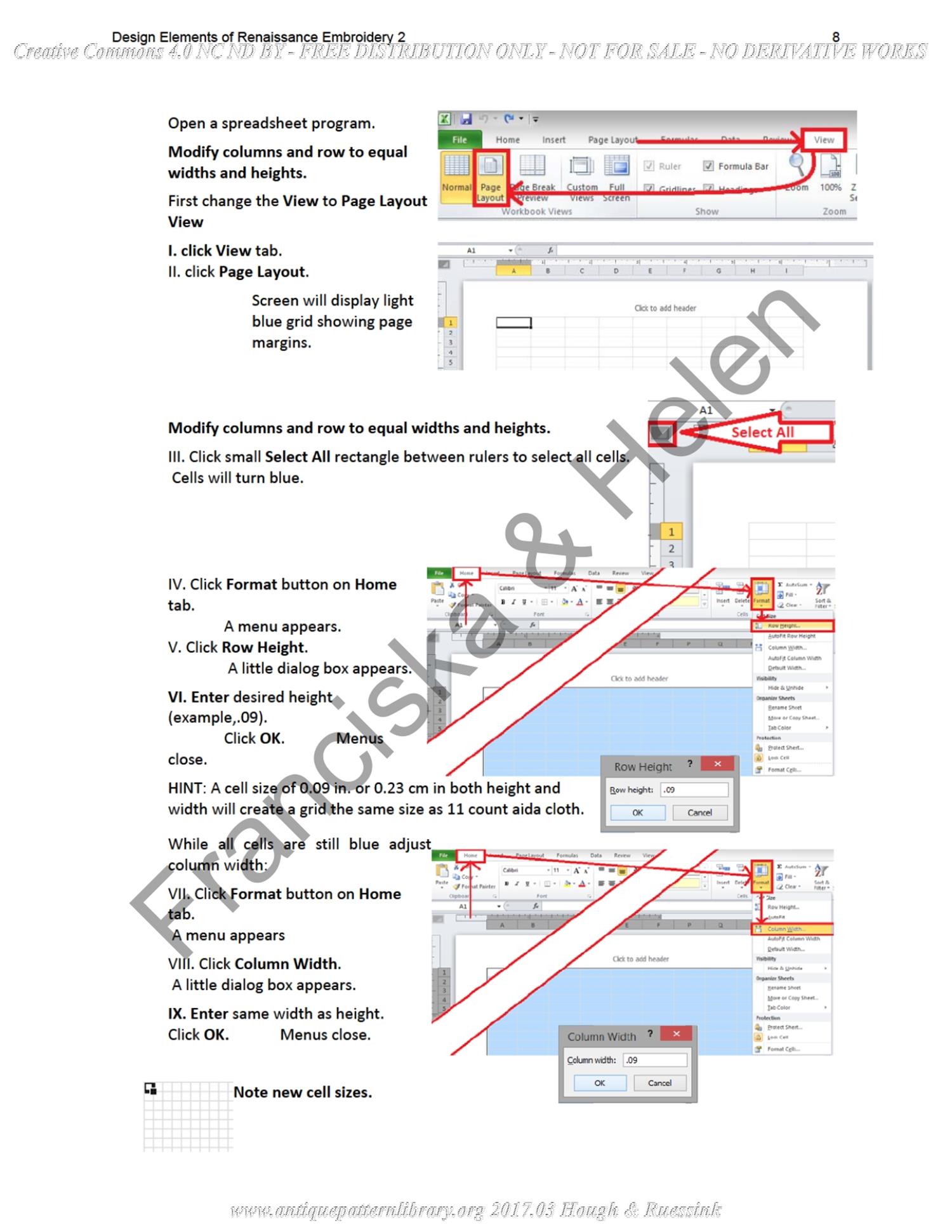 165 pages of block unit designs charted from Renaissance embroidery modelbooks, with author attributions. Designs grouped by type (motif, strapwork designs, alphabets, etc.), and are suitable for cross-stitch, lacis (darned net), and can be adapted for filet crochet, and knitting. Also includes a charting tutorial for graphing block unit designs using common spreadsheet programs.