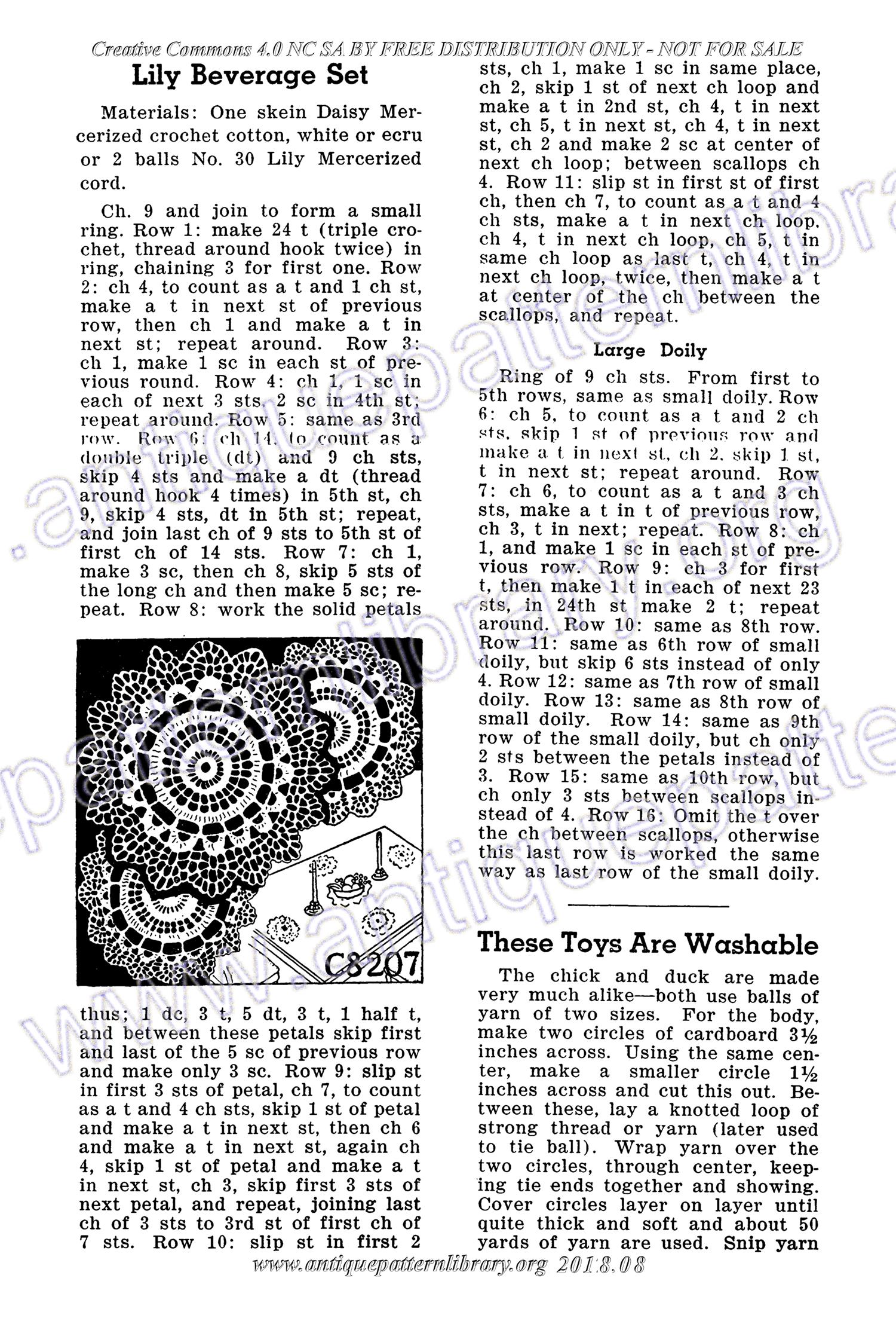 8 pages (4 and 5 combined in one image). Lily Beverage Set, Dogwood Quilt, washable toy duck, chick, and rabbit, and a crocheted bag for your knitting.