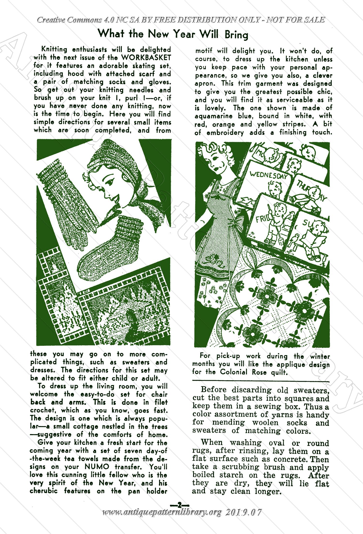 8 pages, page 4 and 5 combined to one. Household tips, quilting: The Breeches Quilt, wrapping packages and tying ribbons in bows, crochet: Directions for Crocheted Edges, sewing: making cushions from rag rugs, and more household tips.