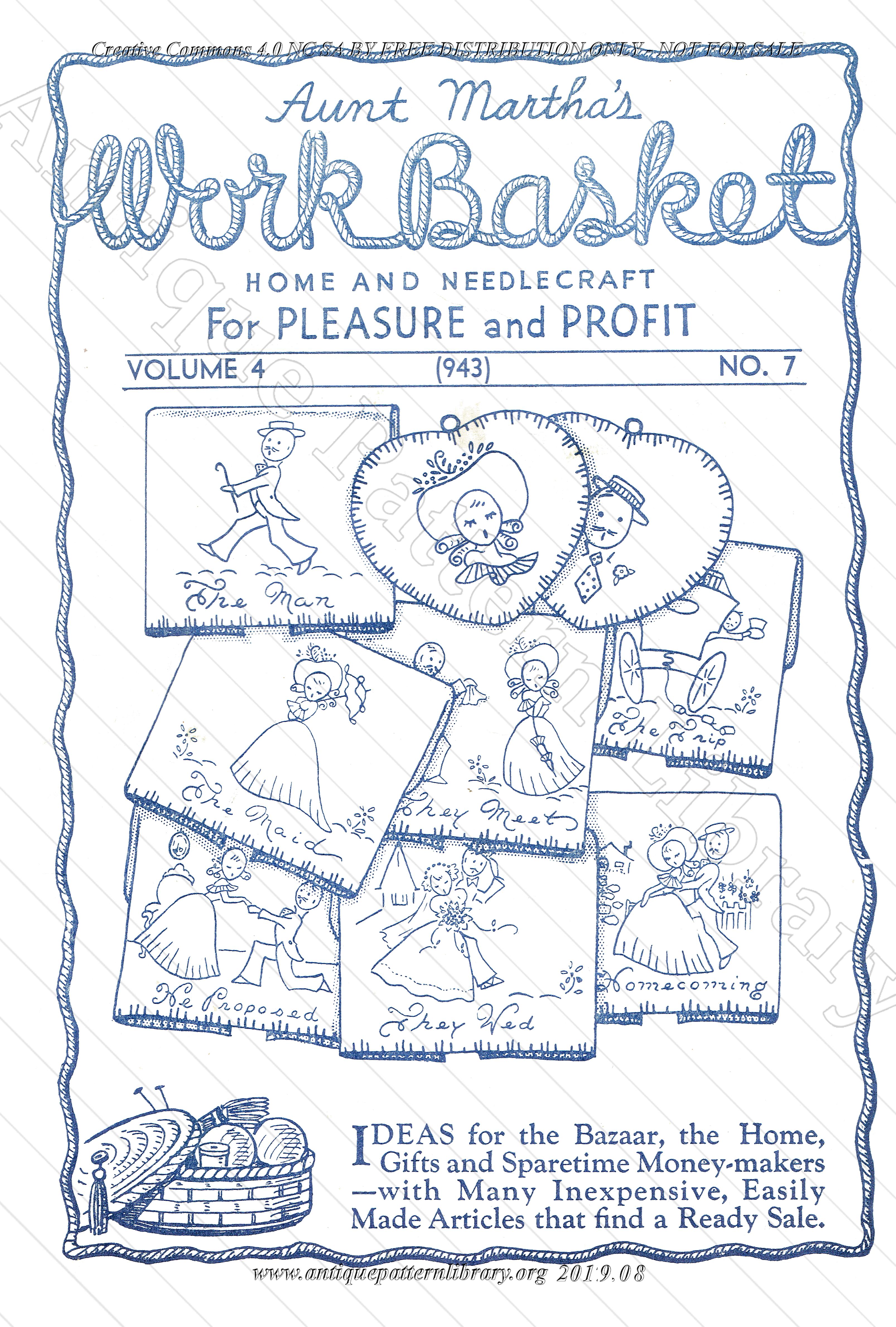 8 pages, page 4 and 5 combined to one. Crochet: Palm Leaf Motif in Crochet Sewing: Handy Garden Apron. Quilt: Flower Basket Quilt (pattern on supplement, which is missing). Household tips.