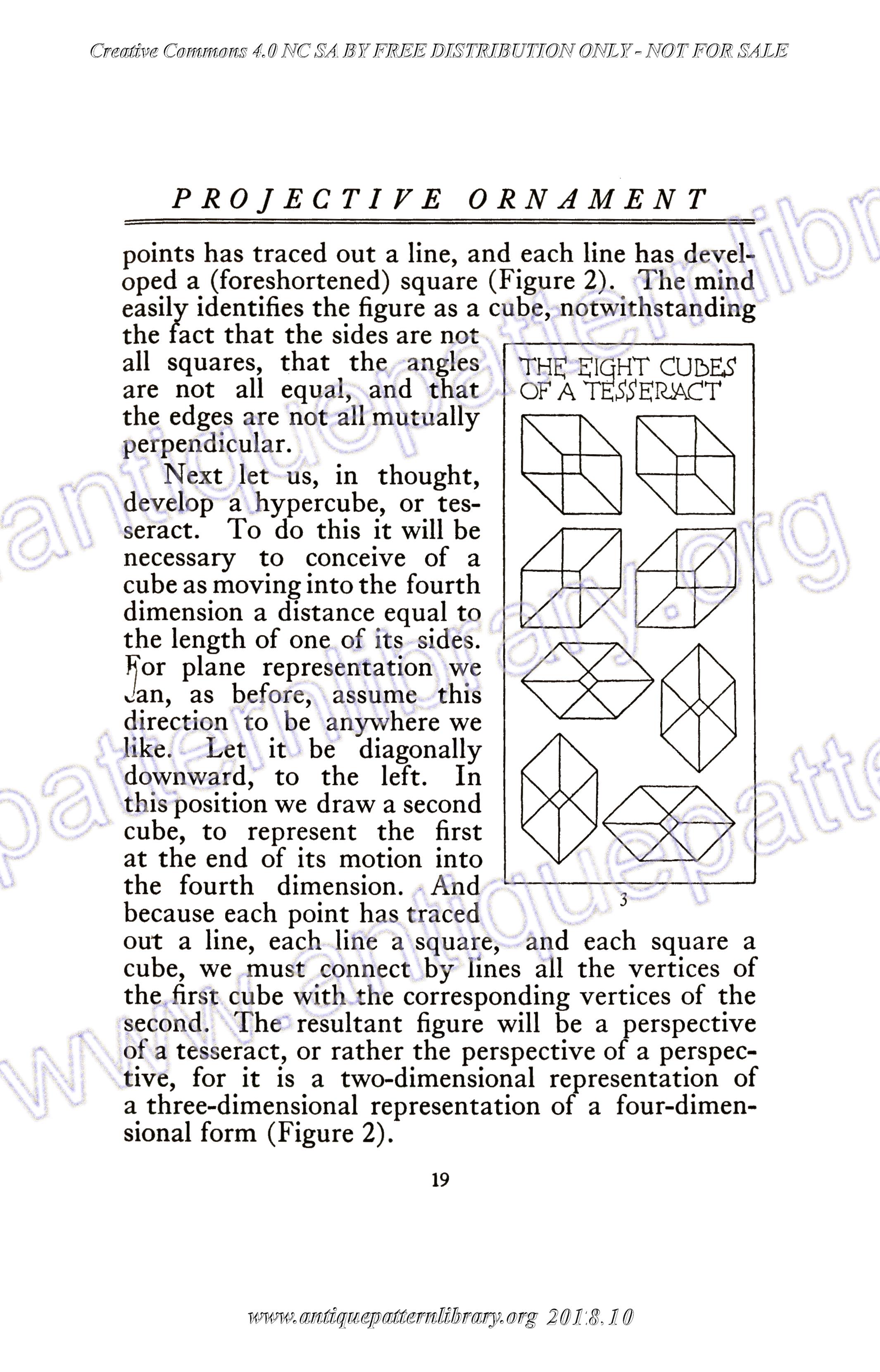 92 pages. The metaphysical background aside, this is a good book to learn about application of geometric figures in ornament design. Two-dimensional projections of four-dimensional objects are explained and illustrations show how these might be applied. Suitable for quilting, leaded glass, wood inlay work, mosaic, embroidery, application work.