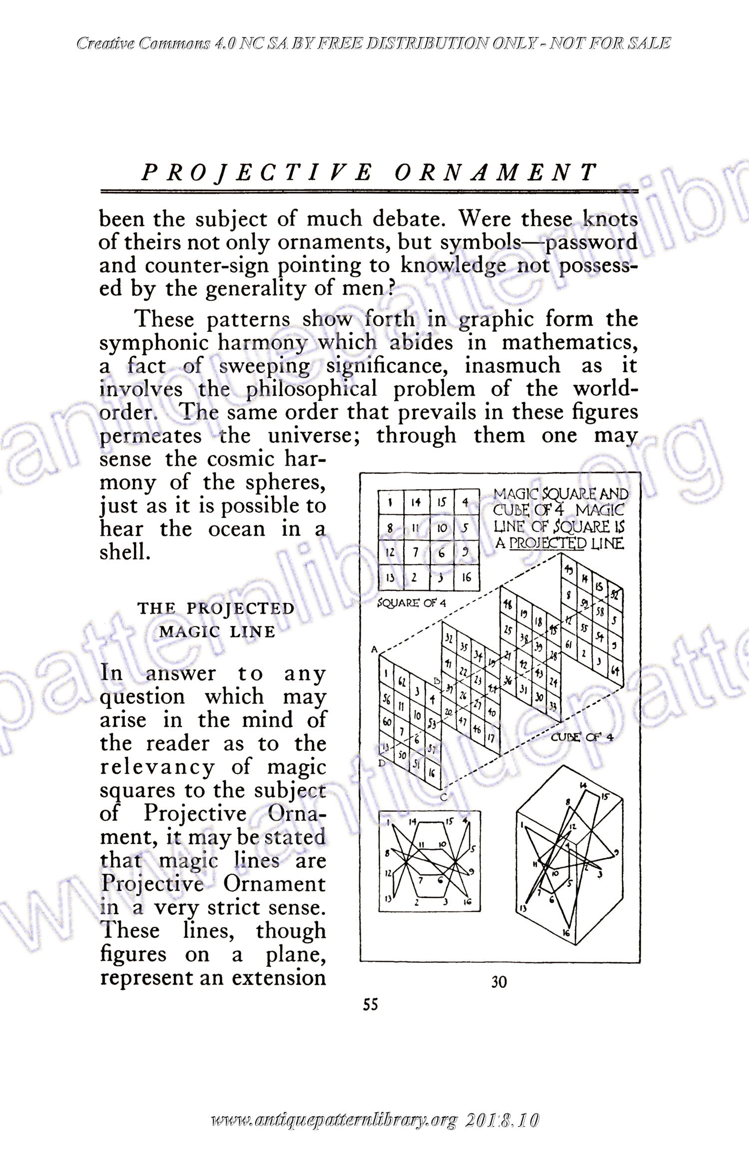 92 pages. The metaphysical background aside, this is a good book to learn about application of geometric figures in ornament design. Two-dimensional projections of four-dimensional objects are explained and illustrations show how these might be applied. Suitable for quilting, leaded glass, wood inlay work, mosaic, embroidery, application work.