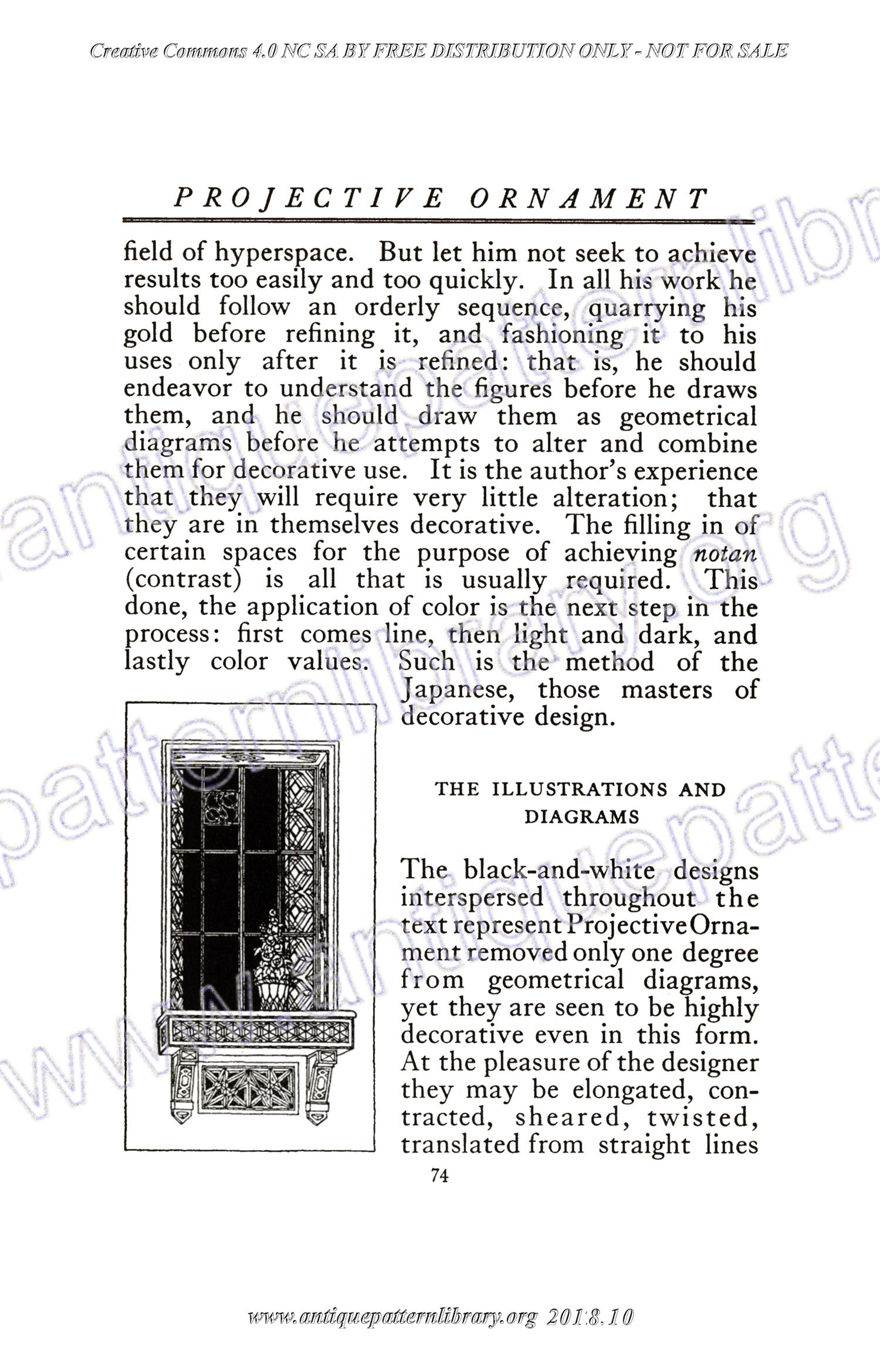 92 pages. The metaphysical background aside, this is a good book to learn about application of geometric figures in ornament design. Two-dimensional projections of four-dimensional objects are explained and illustrations show how these might be applied. Suitable for quilting, leaded glass, wood inlay work, mosaic, embroidery, application work.