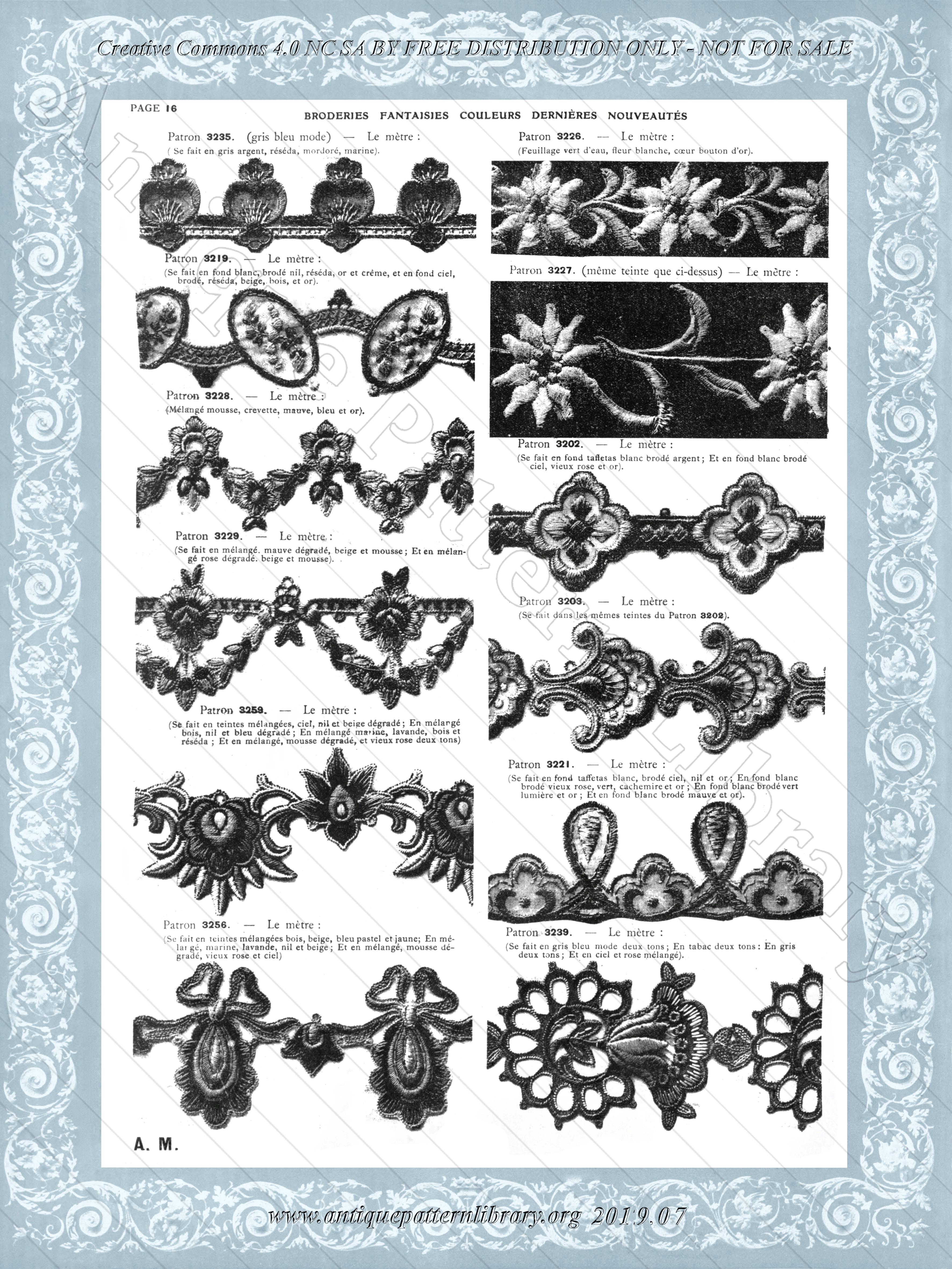 Nota: Nous prions instamment nos Clientes de ne jamais couper les dessins de l"album, pour les demandes il suffit d'indiquer le numero du patron, la nature de l'echantillon et la quantite. Pour les dentelles et broderies ne jamais oublier d'indiquer la nuance.