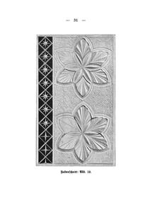 Small stapled softcover, 60 pages including covers. About chip carving, from simple exercises to complex designs. Discusses tools, techniques, applications. Fraktur-script.