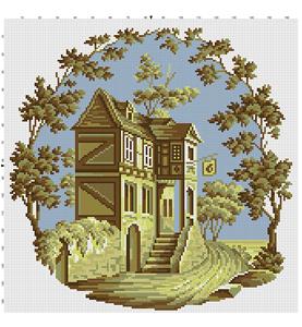House in shades of grey on a light blue background, framed by trees. Size 160 by 160 stitches. A similar, maybe identical pattern appeared later in Aglaja. The left side has been cut off so the exact supplement date is not visible. Might be 6, 16 or 26 June.