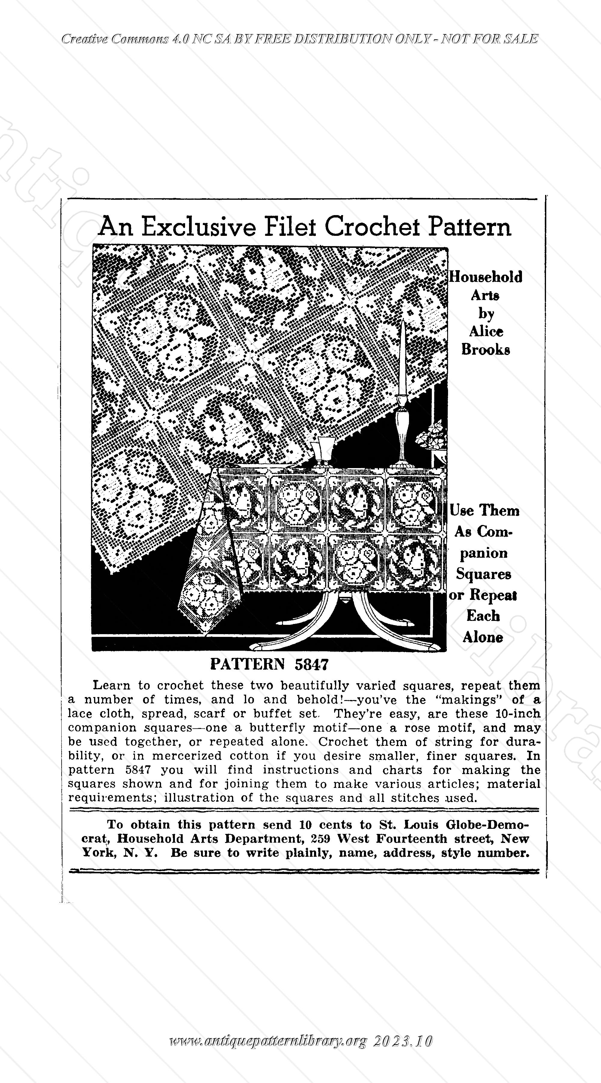 Collection of nearly 200 newspaper clippings of advertisements for doilies and other crochet and knitting patterns, mostly from the St. Louis Globe-Democrat. All patterns are from Alice Brooks. Clippings date from 1936 to early forties. Not all are dated, but they are numbered in sequence. Some patterns have two different advertisements.