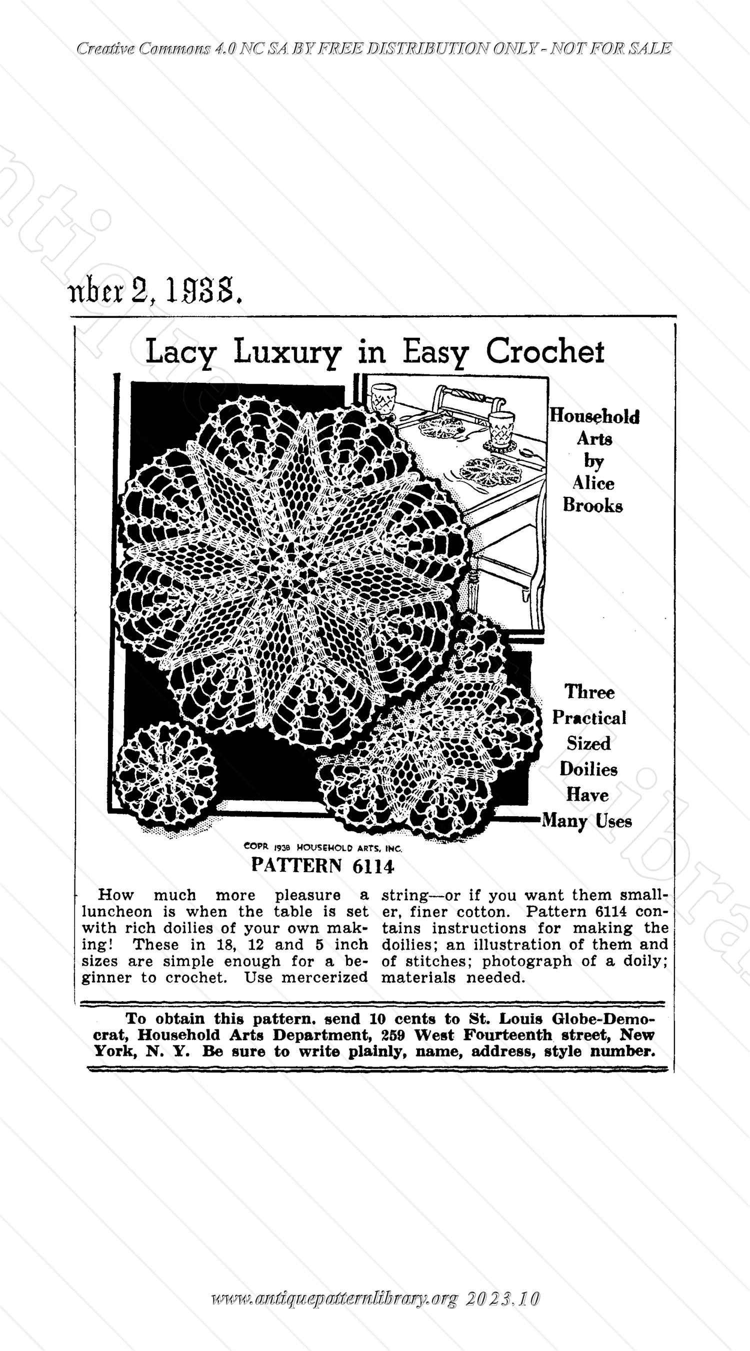 Collection of nearly 200 newspaper clippings of advertisements for doilies and other crochet and knitting patterns, mostly from the St. Louis Globe-Democrat. All patterns are from Alice Brooks. Clippings date from 1936 to early forties. Not all are dated, but they are numbered in sequence. Some patterns have two different advertisements.