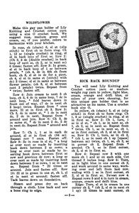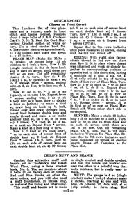 8 pages. Crochet: luncheon set, child's muff and beanie, collar, dainty daisy motif. Tatting: hexagon tatted doily. Knitting: knitted scarf.
