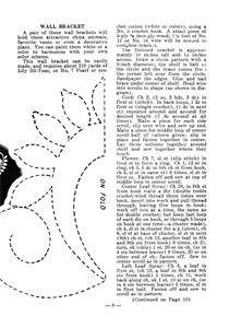 Folded but not stapled, 16 pages, pages 7 and 8 combined into one. Crochet: "Mayflowers" Chair Set. Huck darning: three borders ends for towels. More crochet: Wall bracket with flowers. Quilting: Aunt Etta's Diamond Quilt. Crochet: Wild Rose Doily, Irish Crochet Edging. Tatting: tatted edging.