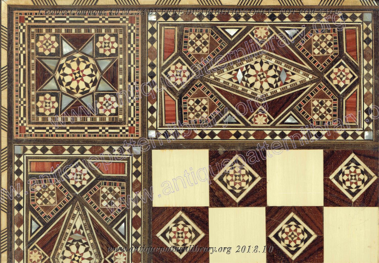 Scans of Middle-Eastern chessboards, showing four inlay designs: corner square, top rectangle, and two small chessboard fields. The chessboards have a backgammon board on the inside, with its own inlay design, which will be done later. The designs are also suitable for quilting, mosaic, and leaded glass work.