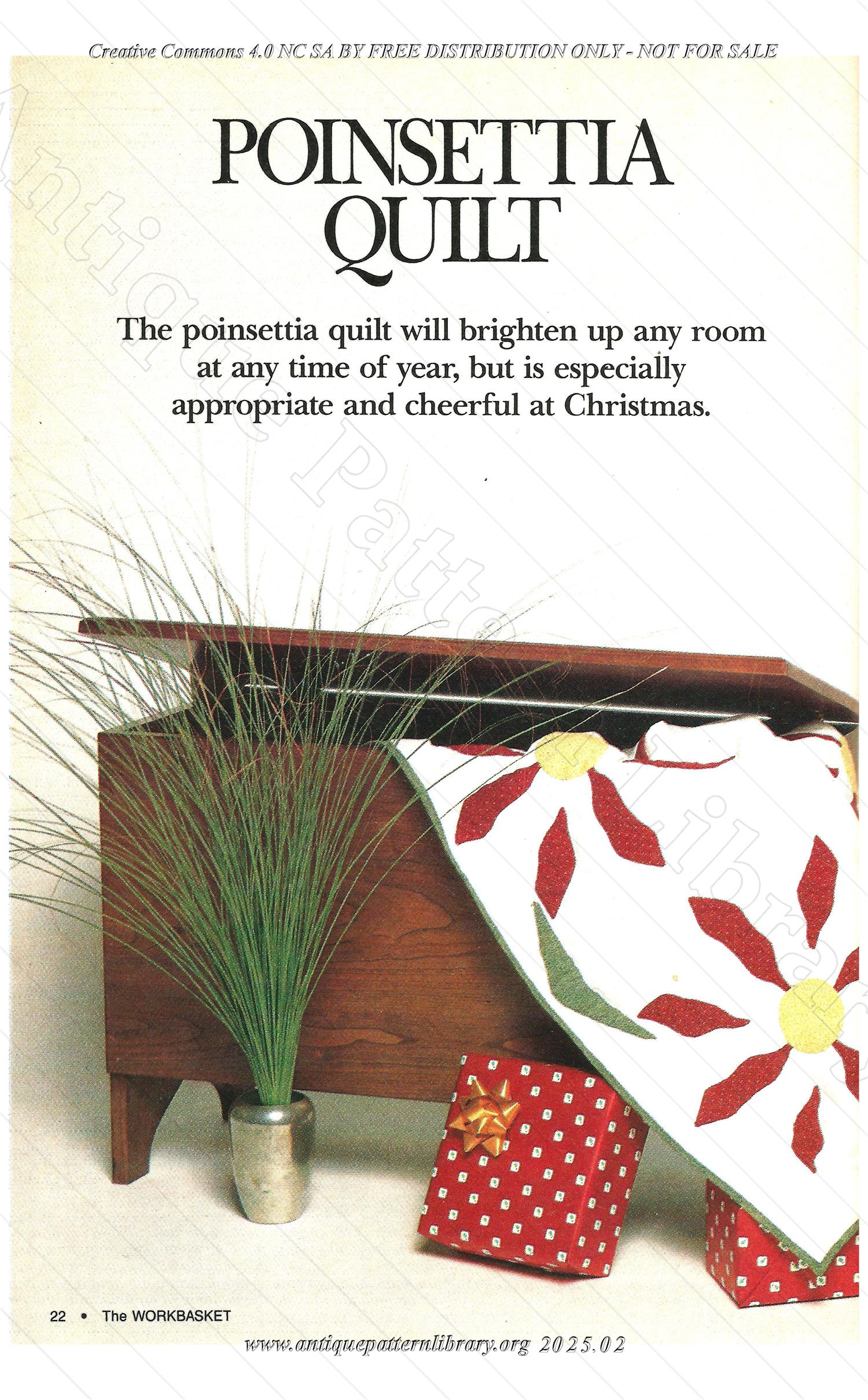 Knitting: Kids' sweaters, patchwork sweater. Crochet: Christmas Tree Skirt. Quilting: Poinsettia Quilt. Embroidery: Easy cross-stitch projects, small charted christmas motifs, cross-stitched table runner. Sewing: calico wreath, Christmas placemats. Crafting: ribbon pinecones, plastic canvas Christmas charm.