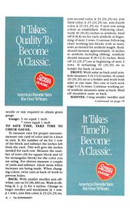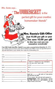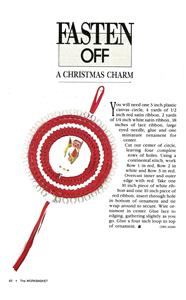 Knitting: Kids' sweaters, patchwork sweater. Crochet: Christmas Tree Skirt. Quilting: Poinsettia Quilt. Embroidery: Easy cross-stitch projects, small charted christmas motifs, cross-stitched table runner. Sewing: calico wreath, Christmas placemats. Crafting: ribbon pinecones, plastic canvas Christmas charm.