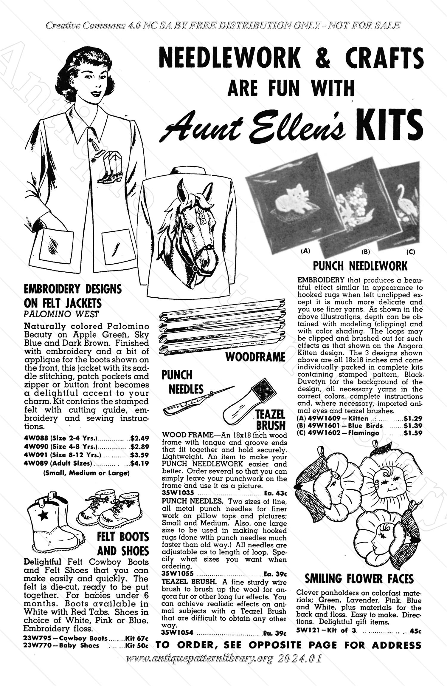 48 pages including covers. Crochet: Place Mat, Pansy Hot Dish Mat, Roses for Pillow Slips. Knitting: Sweet Miss knitted toddler dress. Tatting: Tatted Vanity Set. Paper Art: Carnations from tissue paper. Ribbon Art: Tying bows. Cooking: Hot Stuffed Eggs, Bacon and eggs receipt, Barbecued Frankfurters, Picnic Meat Loaf, Frozen Strawberry Supreme, Strawberry Puffs. Sewing: Basic Hand Stitches, Dressing up Mirrors. Quilting: Baby Necktie Quilt. The Junior Workbasket, gardening, pimping old trunks, painting Junior Rembrandt.