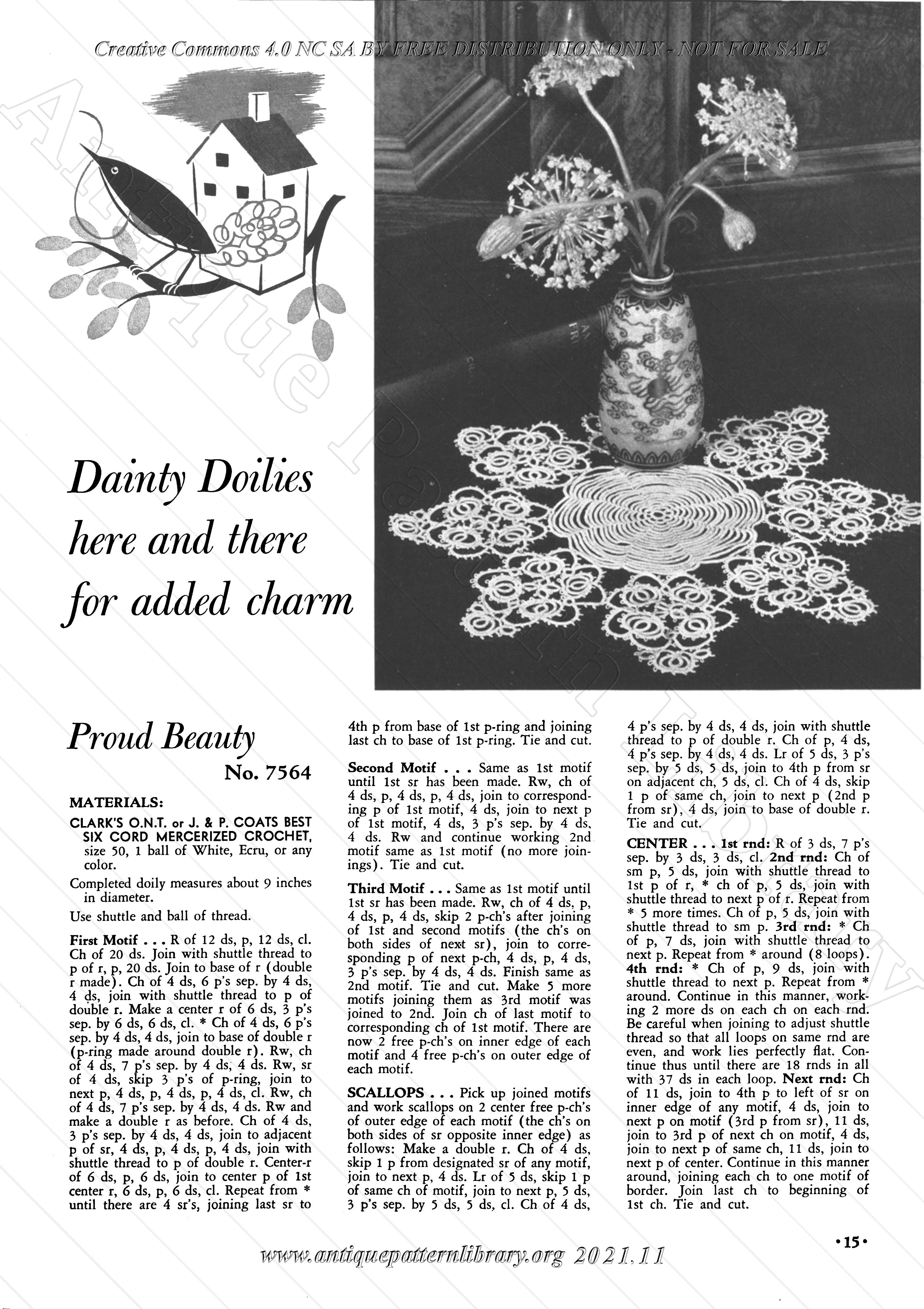 24 pages including covers. Luncheon sets containing centerpiece, place doilies, bread and butter plate doilies, and even glass doilies. Bread tray doilies, a tatted corner for a linen doily, collars and cuffs, kerchief edgings, flower spray and boutonniere, T-square tablecloth insertion, motifs for household linens, curtain pulls, doilies, edgings suitable for towels and other purposes.